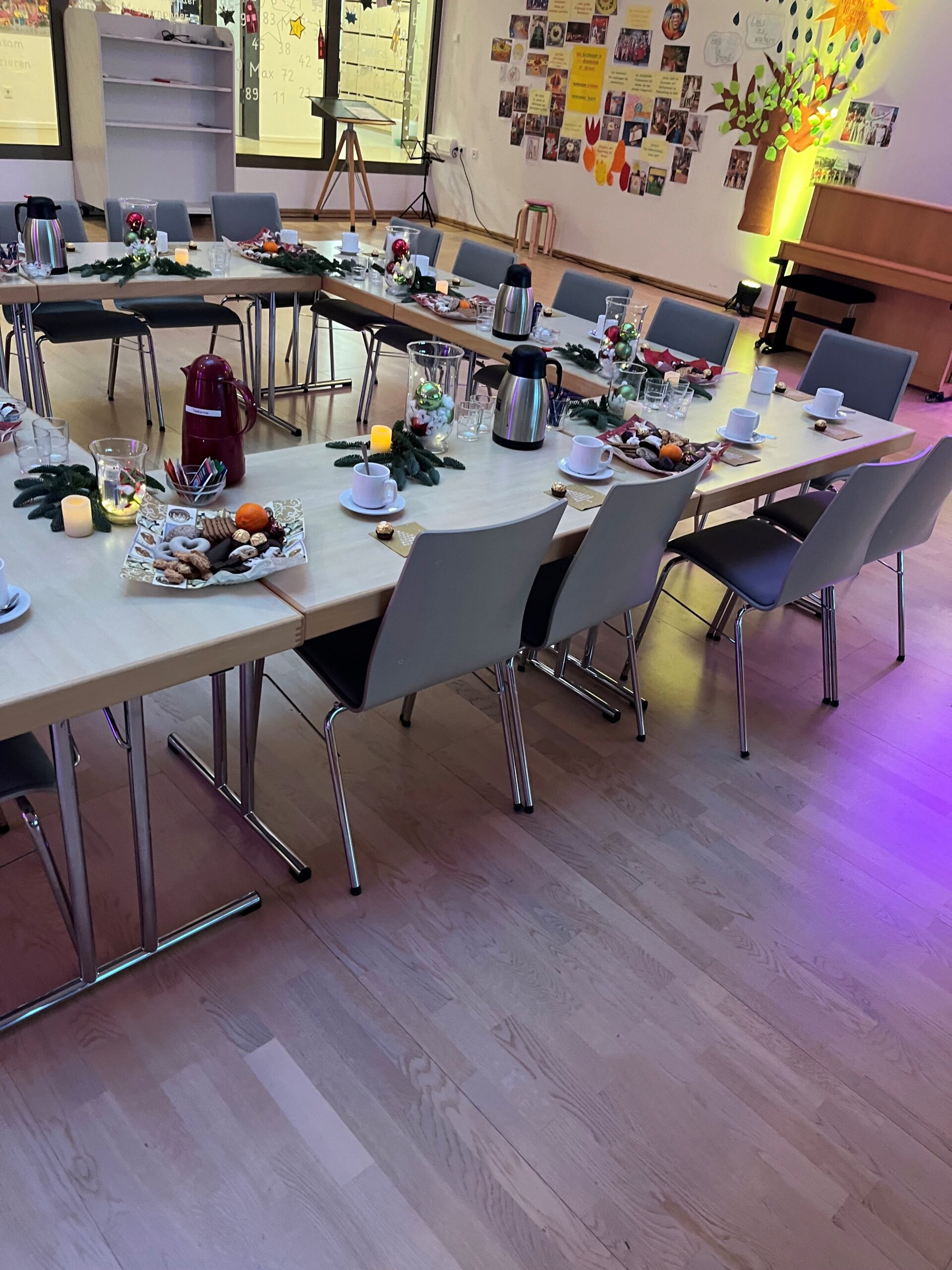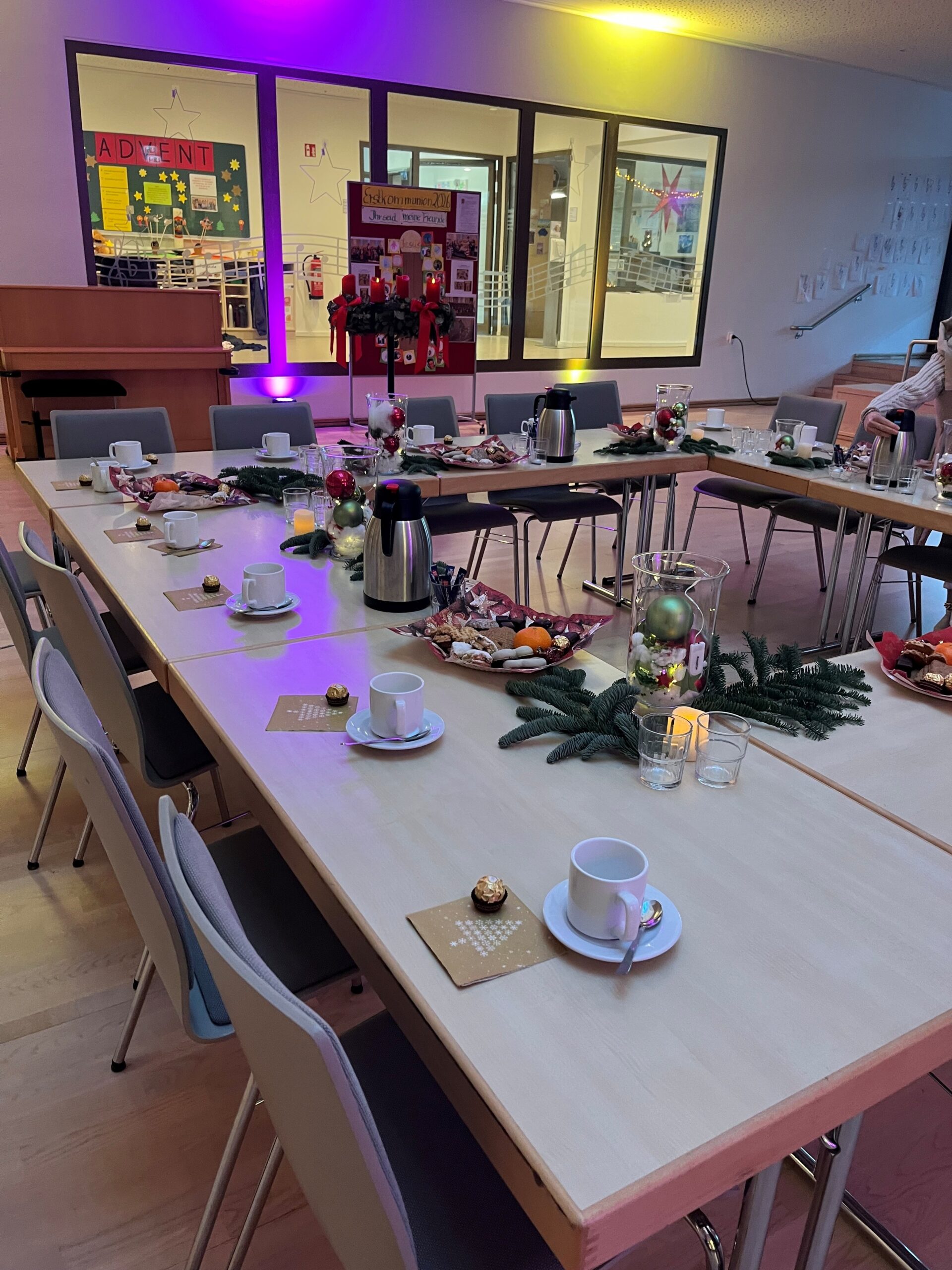 Die Schulleitungen aller drei Schulen luden die Mitarbeiterinnen und Mitarbeiter aus Verwaltung, Haustechnik und Schulsozialarbeit zu einem gemeinsamen Frühstück und Rückblick auf das zurückliegende Jahr ein. Das Treffen fand im toll hergerichteten Atrium der Grundschule statt.