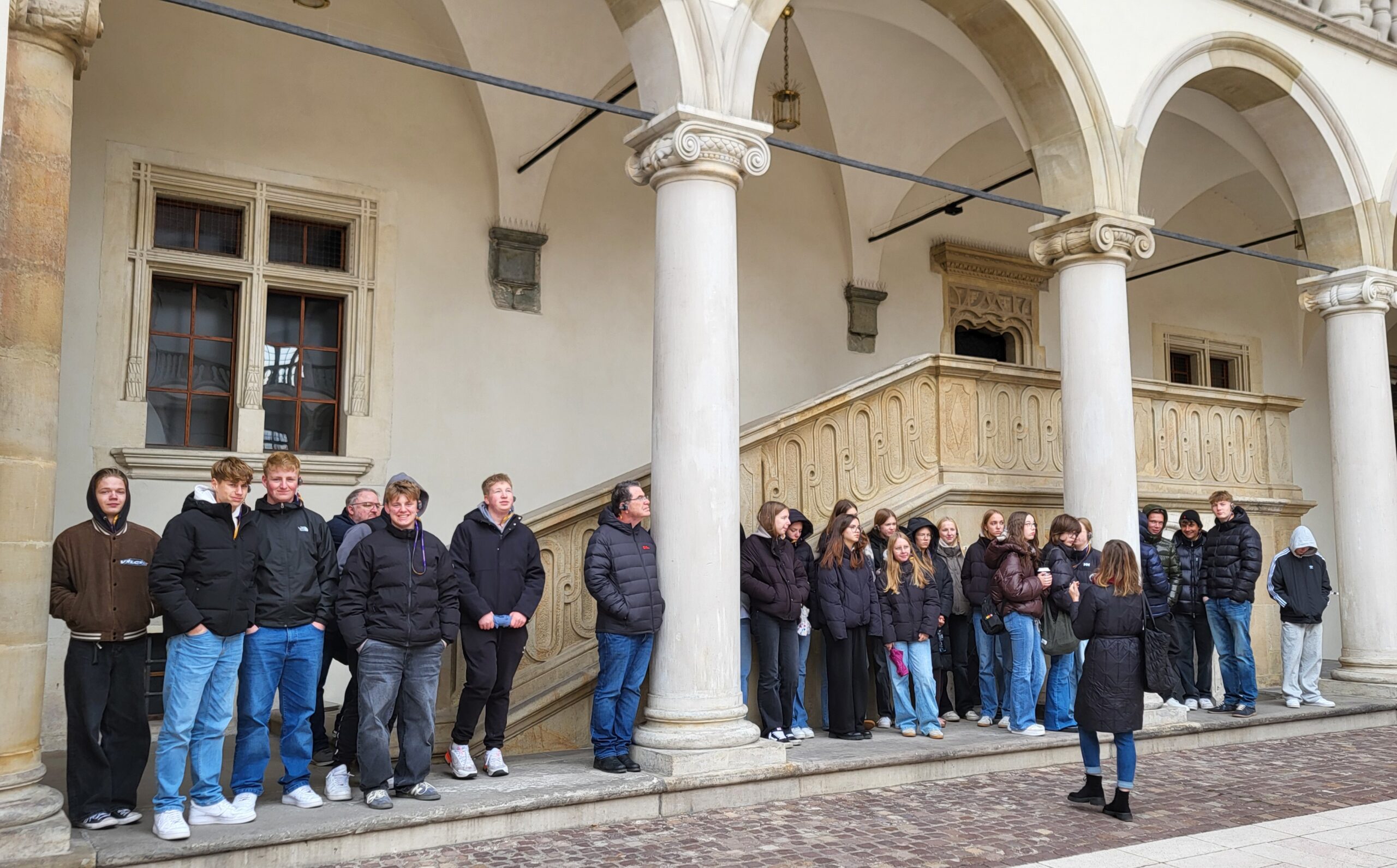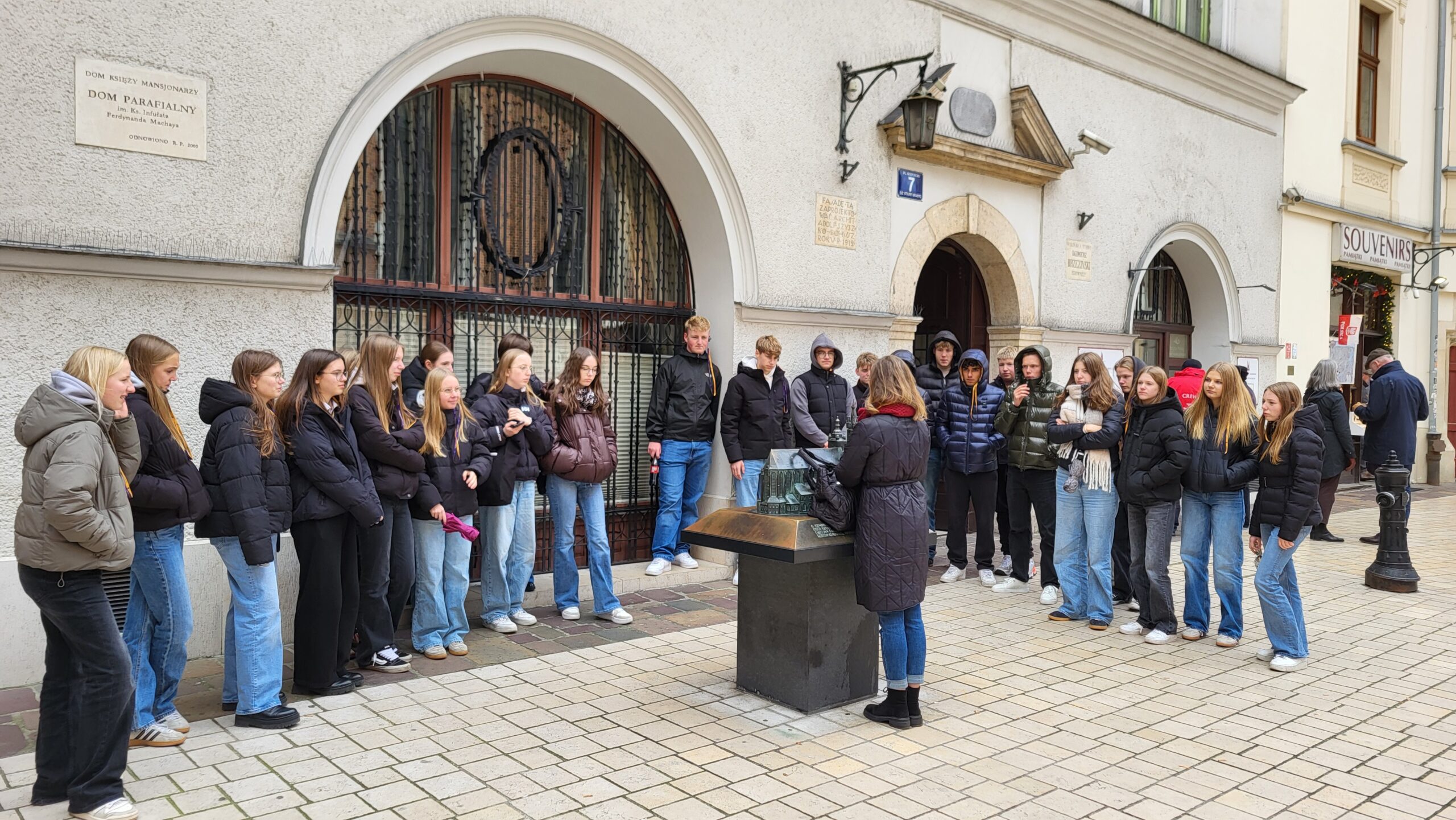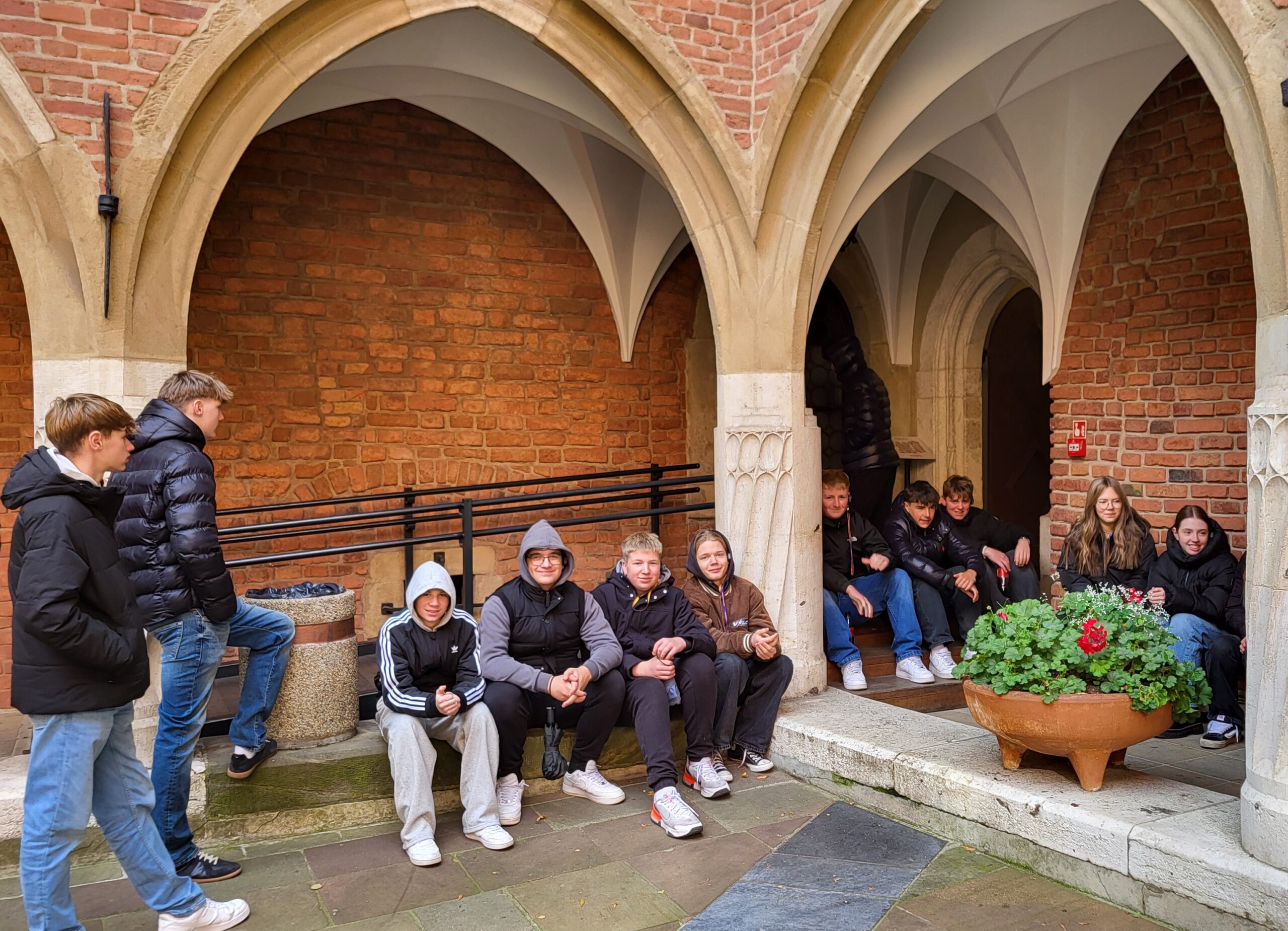 Begleitet wurden die Schüler/innen durch den BDKJ-Leiter N. Schnittger und eine der Klassenlehrerinnen K. Reinstadler. Bereits direkt nach der langen Nachtfahrt startete das Programm nach einem kurzen Frischmachen und Frühstücken mit einer 4-stündigen Stadtführung, bei der wir historische wie zeitgenössische Sehenswürdigkeiten betrachten konnten und viele interessante Informationen über das historische und gegenwärtige Krakau erhielten. Nach einer kurzen Mittagspause waren wir ins deutsche Konsulat eingeladen, wo uns der Generalkonsul Holger Mahnicke persönlich begrüßte und interessante Einblicke in seinen Werdegang und die Aufgaben des Konsulats in Krakau gab. Ein leckeres gemeinsames Abendessen, bei dem auch die Möglichkeit bestand, sich über das Erlebte auszutauschen, beendete das offizielle Programm für diesen Tag.