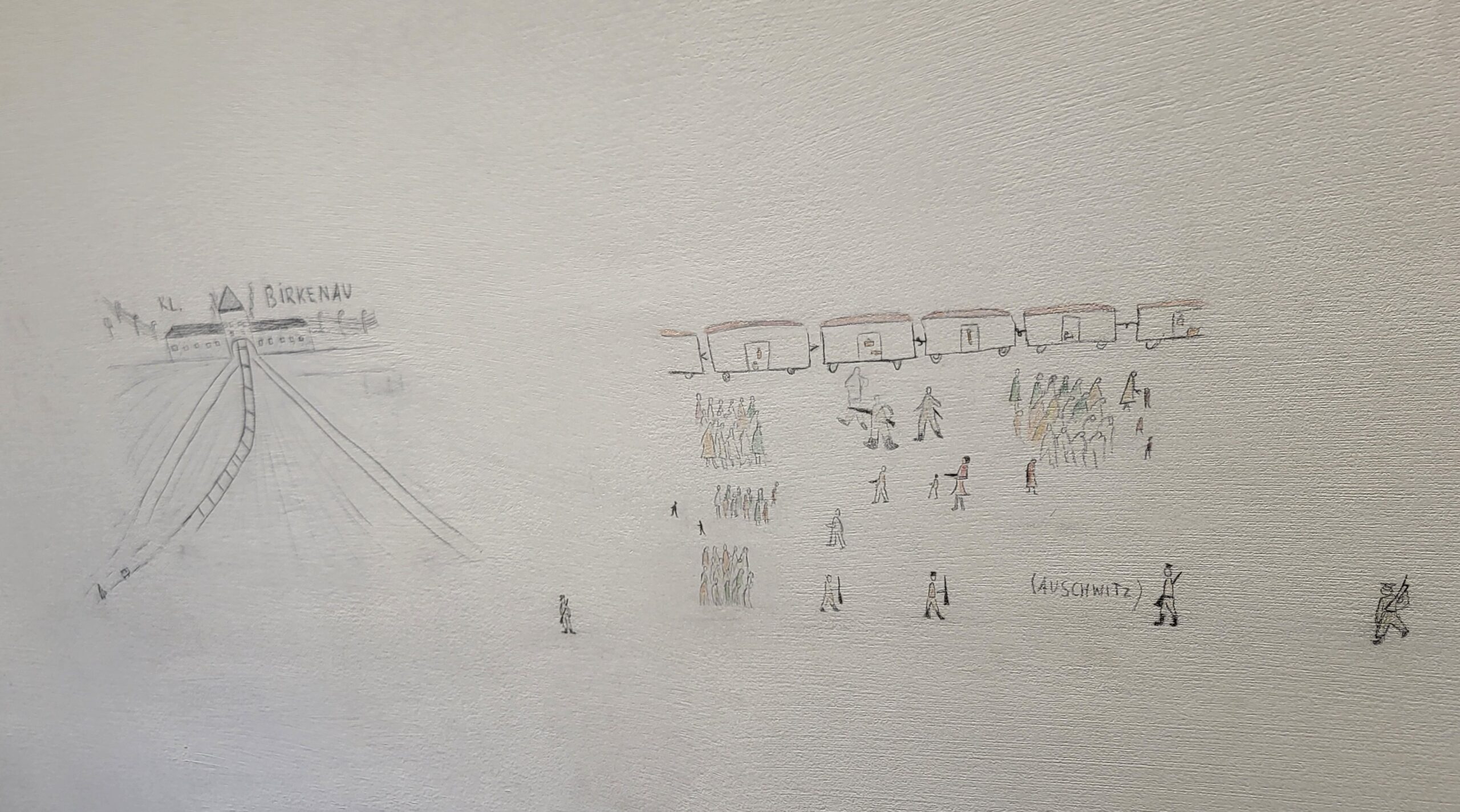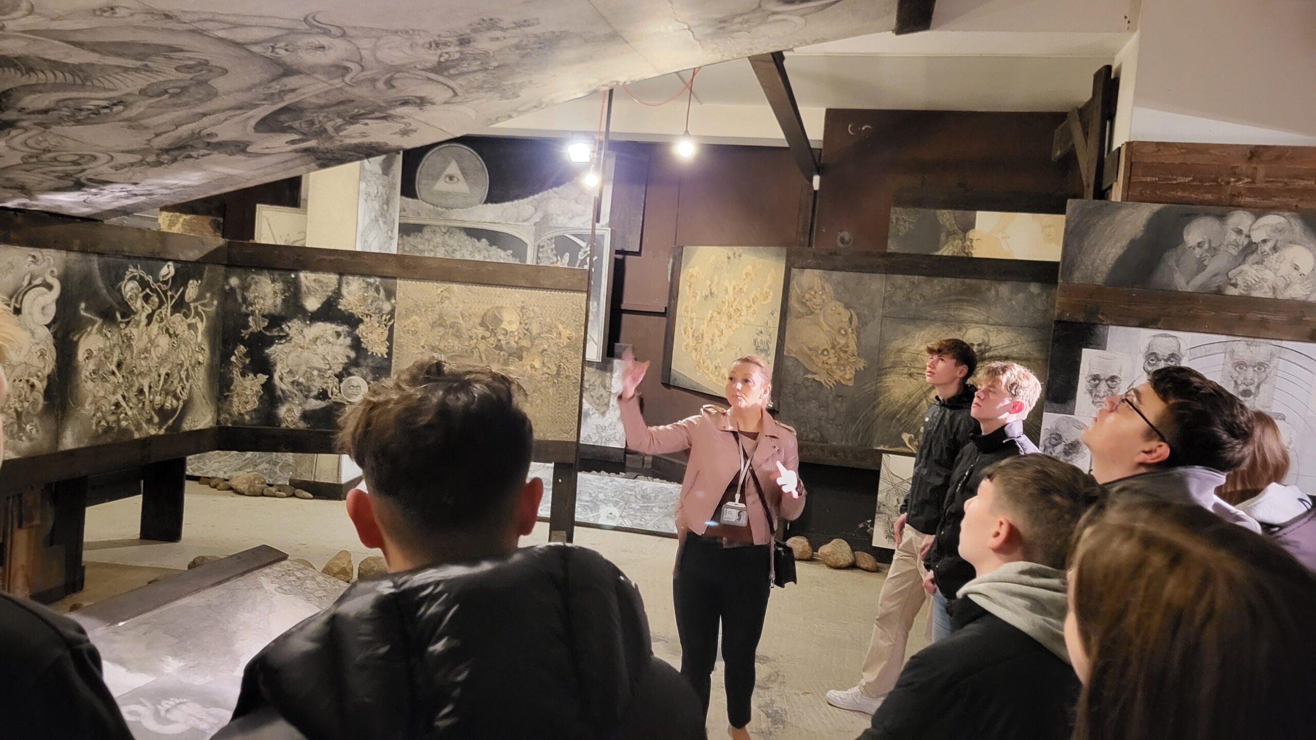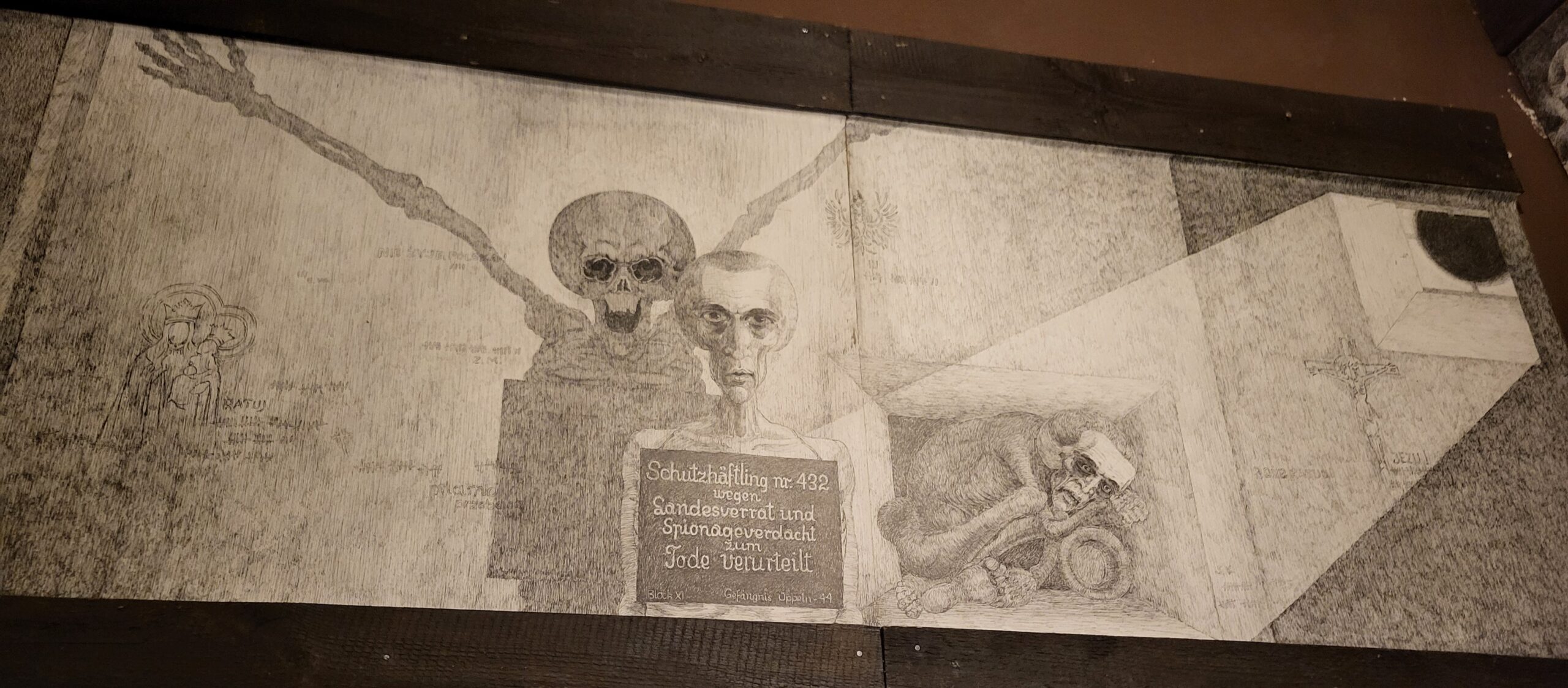 Am Mittwochmorgen ging es nach einem ausführlichen Frühstück wieder zur Gedenkstätte Auschwitz-Birkenau, wo wir uns in zwei Gruppen aufteilten, um im Wechsel zwei besondere Programmpunkte durchzuführen. Zum einen durften wir das nichtöffentliche Kunstarchiv von Auswitz-Birkenau besuchen, wo wir im Rahmen eines Workshops die Funktion und Bedeutung künstlerischer Betätigung im KZ Auschwitz-Birkenau beleuchteten. Dabei bekamen wir sowohl Auftragsarbeiten von Nazi-Personal an einsitzende jüdische Künstler als auch berührende (heimlich angefertigte) Werke jüdischer Künstler während und nach der Gefangenschaft in Auschwitz-Birkenau zu sehen. Von manchen erfuhren wir ihre Entstehungsgeschichte, von manchen waren aber auch keine Hintergründe bekannt, ihre intensive Aussagekraft sprach jedoch für sich selbst. Zum anderen erhielten wir eine beeindruckende Führung durch die Ausstellung „Klisze pamięci – Labirynty“ von Marian Kolodziej im Franziskanerkloster in Harmęźe. Der Franziskaner und Künstler war u.a. Häftling im KZ Auschwitz und erlebte die Gräuel der nationalsozialistischen Vernichtungsmaschinerie am eigenen Leibe. Nach dem Krieg studierte er Bühnengestaltung in Krakau, litt Zeit seines Lebens unter den erlebten Gräueln konnte sich aber bis wenige Jahre vor seinem Tod nicht damit auseinandersetzen. Erst in hohem Alter, bereits durch eine schwere Krankheit gezeichnet, begann er sich mit seinen zum Teil überdimensionalen Zeichnungen mit dem erlebten Leid in den Konzentrationslagern auseinanderzusetzen. Dabei entstanden erschütternde Bilder, die gemäß seinem Wunsch im Keller des Franziskanerklosters in einer Gesamtschau ausgestellt werden. Sie machten in ihrer dreidimensionalen Anordnung für uns Betrachter das unfassbare Leid der Lagerinsassen spürbar, ja fast erfahrbar, so eindrücklich war das Erleben dieser dichten, aussagekräftig gestalteten Bilder. Tief beeindruckt und das Grauen dieser Zeit im Nacken verließen wir diese erschütternde Ausstellung und genossen im Anschluss den passend hervorbrechenden Sonnenschein im daneben angelegten Zen-Garten des Klosters, um einmal durchzuatmen und das Grauen etwas abzuschütteln.