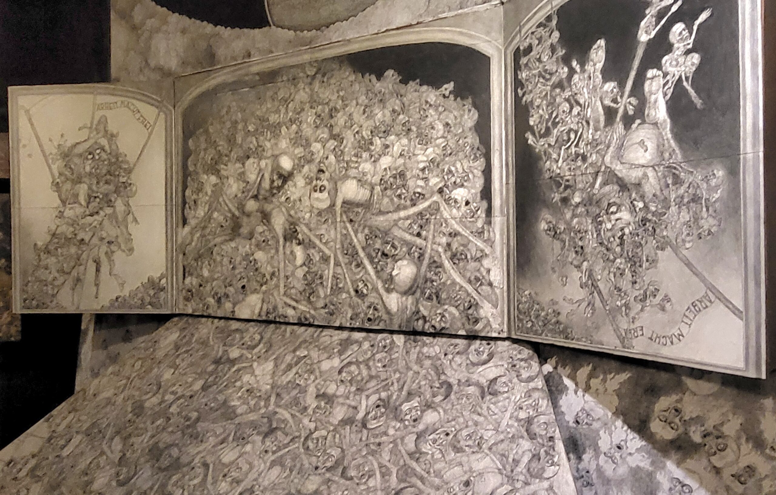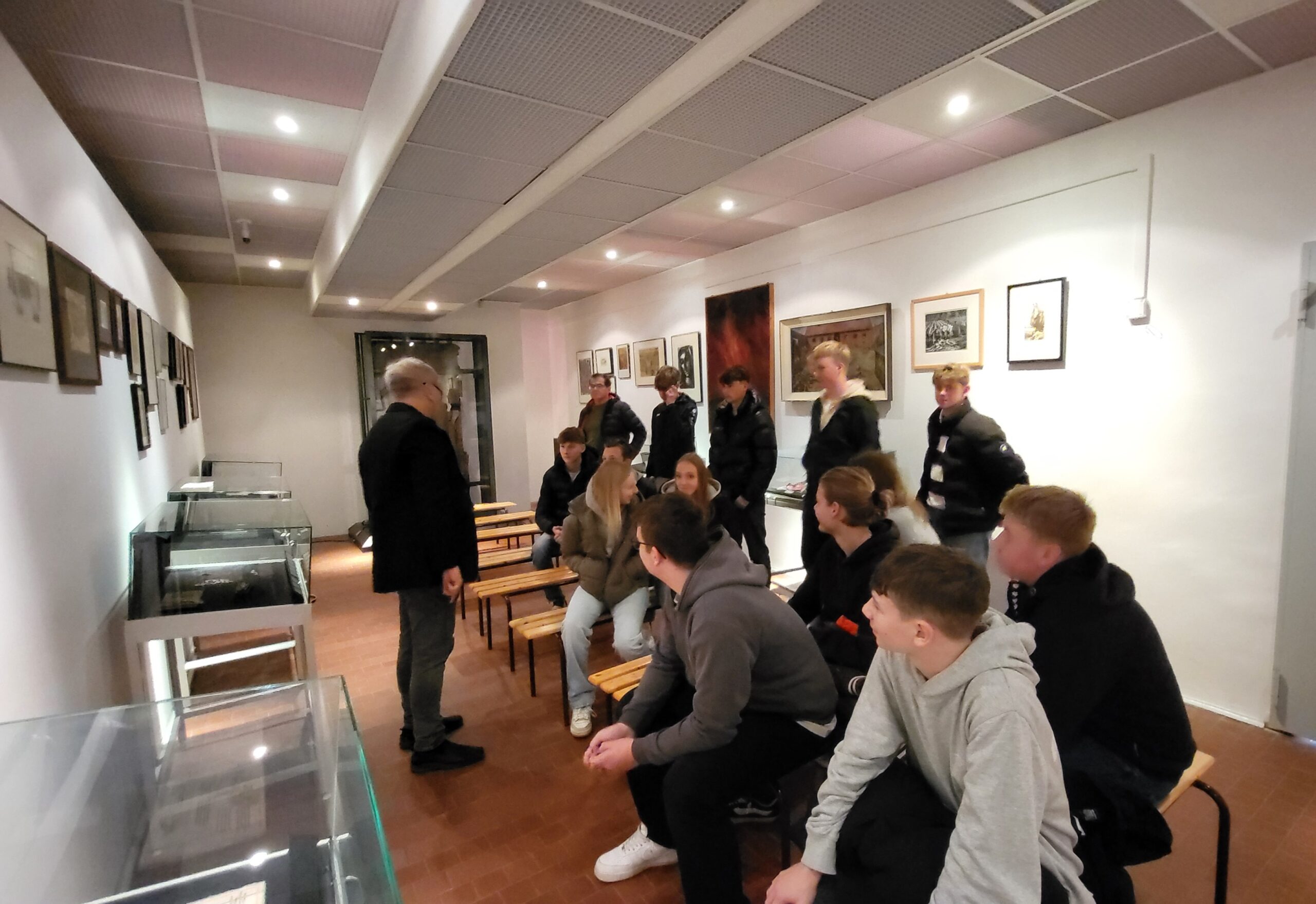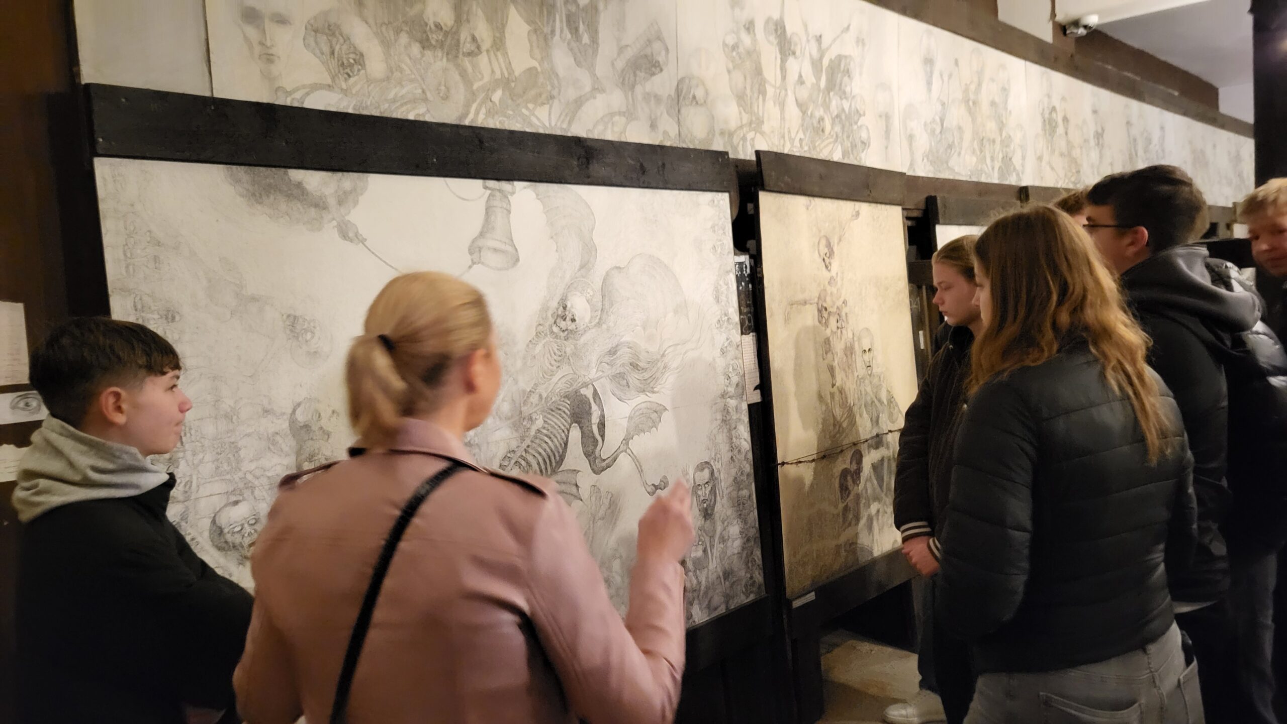 Am Mittwochmorgen ging es nach einem ausführlichen Frühstück wieder zur Gedenkstätte Auschwitz-Birkenau, wo wir uns in zwei Gruppen aufteilten, um im Wechsel zwei besondere Programmpunkte durchzuführen. Zum einen durften wir das nichtöffentliche Kunstarchiv von Auswitz-Birkenau besuchen, wo wir im Rahmen eines Workshops die Funktion und Bedeutung künstlerischer Betätigung im KZ Auschwitz-Birkenau beleuchteten. Dabei bekamen wir sowohl Auftragsarbeiten von Nazi-Personal an einsitzende jüdische Künstler als auch berührende (heimlich angefertigte) Werke jüdischer Künstler während und nach der Gefangenschaft in Auschwitz-Birkenau zu sehen. Von manchen erfuhren wir ihre Entstehungsgeschichte, von manchen waren aber auch keine Hintergründe bekannt, ihre intensive Aussagekraft sprach jedoch für sich selbst. Zum anderen erhielten wir eine beeindruckende Führung durch die Ausstellung „Klisze pamięci – Labirynty“ von Marian Kolodziej im Franziskanerkloster in Harmęźe. Der Franziskaner und Künstler war u.a. Häftling im KZ Auschwitz und erlebte die Gräuel der nationalsozialistischen Vernichtungsmaschinerie am eigenen Leibe. Nach dem Krieg studierte er Bühnengestaltung in Krakau, litt Zeit seines Lebens unter den erlebten Gräueln konnte sich aber bis wenige Jahre vor seinem Tod nicht damit auseinandersetzen. Erst in hohem Alter, bereits durch eine schwere Krankheit gezeichnet, begann er sich mit seinen zum Teil überdimensionalen Zeichnungen mit dem erlebten Leid in den Konzentrationslagern auseinanderzusetzen. Dabei entstanden erschütternde Bilder, die gemäß seinem Wunsch im Keller des Franziskanerklosters in einer Gesamtschau ausgestellt werden. Sie machten in ihrer dreidimensionalen Anordnung für uns Betrachter das unfassbare Leid der Lagerinsassen spürbar, ja fast erfahrbar, so eindrücklich war das Erleben dieser dichten, aussagekräftig gestalteten Bilder. Tief beeindruckt und das Grauen dieser Zeit im Nacken verließen wir diese erschütternde Ausstellung und genossen im Anschluss den passend hervorbrechenden Sonnenschein im daneben angelegten Zen-Garten des Klosters, um einmal durchzuatmen und das Grauen etwas abzuschütteln.