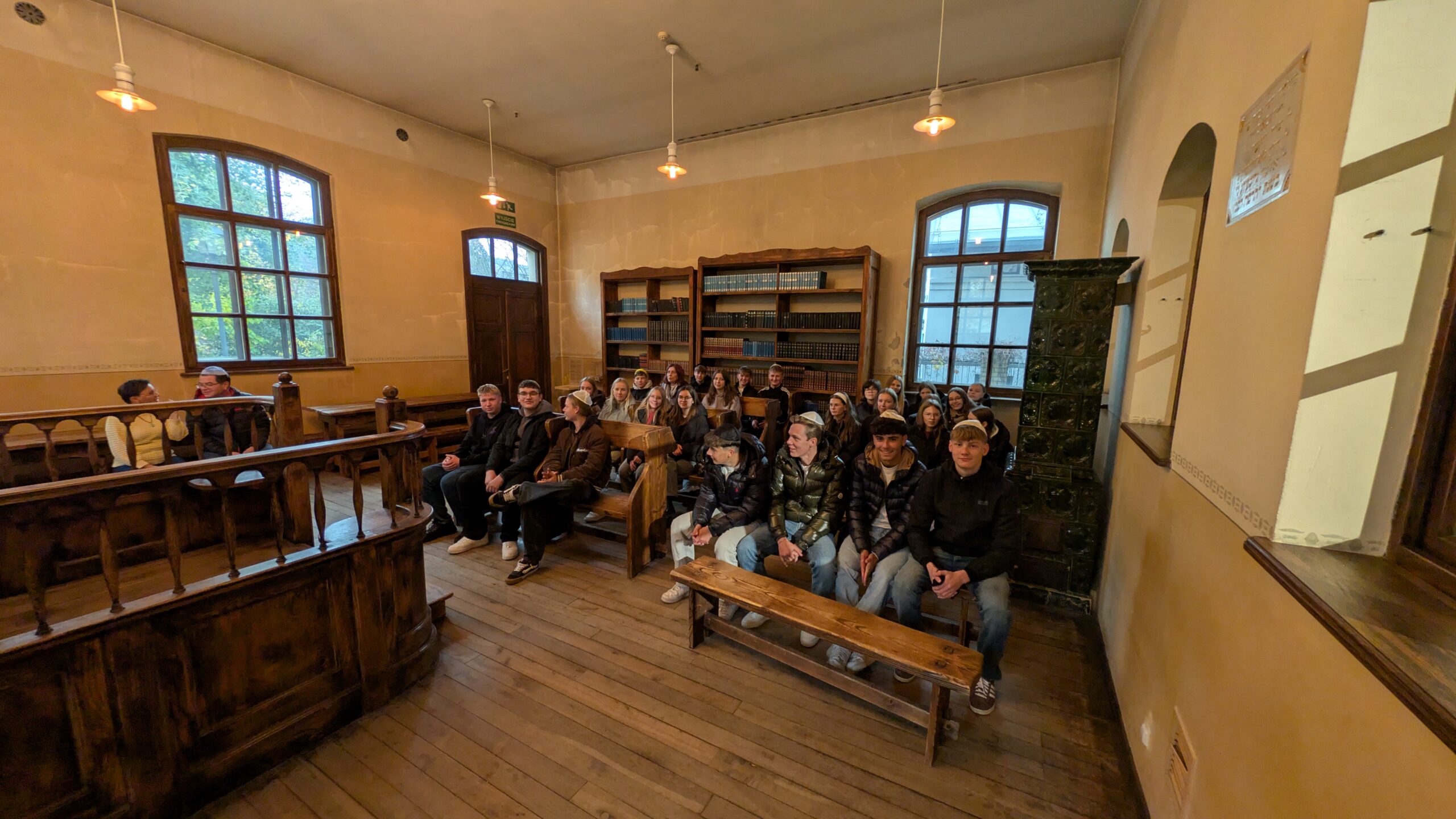 Die Mittagspause in Oświęcim brauchten wir alle, um diese Eindrücke etwas zu verarbeiten und unseren Geist für die nachmittags stattfindende Stadtführung durch die Altstadt Oświęcims wieder fei zu bekommen, bei der wir außer den Sehenswürdigkeiten der Stadt auch das alltägliche jüdische Leben einiger Familien vor dem Holokaust vorgestellt bekamen. Der Besuch des jüdischen Zentrums und der Chevra Lomdei Mishnayot Synagoge, in der wir über das jüdische religiöse Leben, seine Riten und Regeln informiert wurden, rundeten das heutige Programm ab. Zurück in Krakau entspannten wir uns beim leckeren gemeinsamen Abendessen und anschließend auf unseren Zimmern im Hotel.