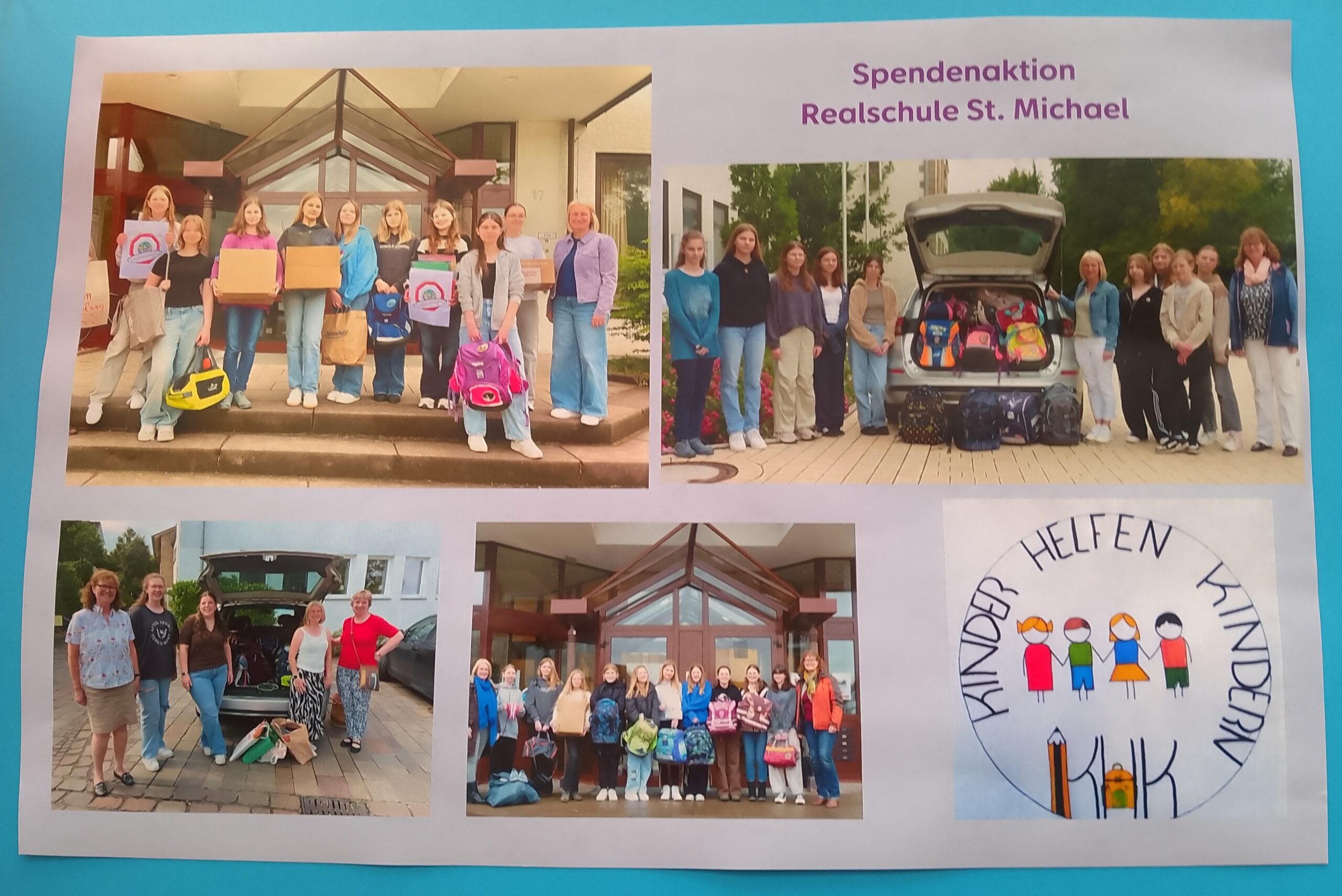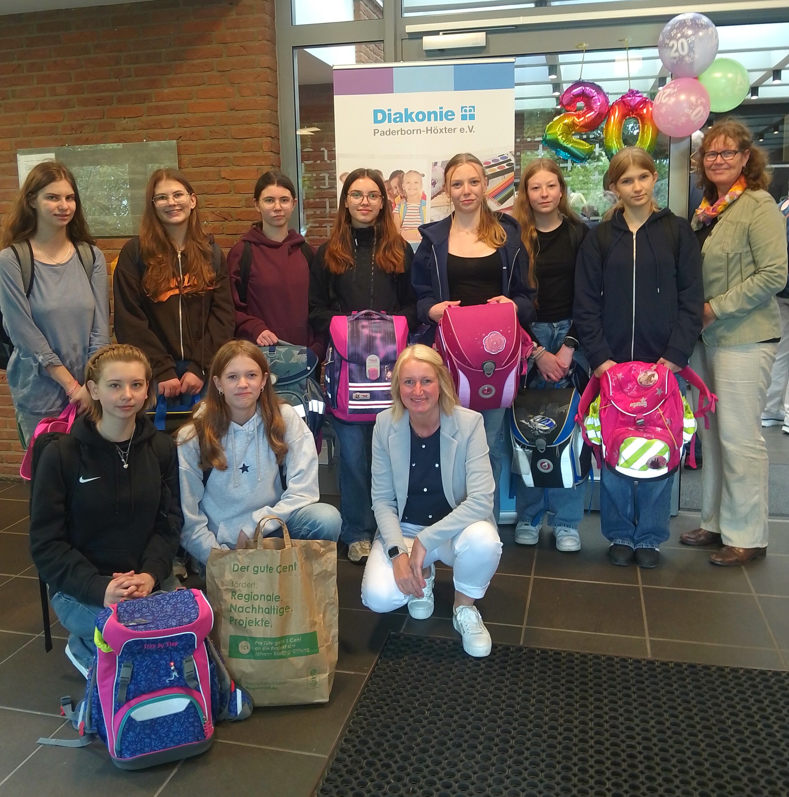 Dazu hatte die Leiter des Projektes Frau Nicole Vogt auch Schulseelsorgerin Bettina Schmidt und das fleißige Spendenteam aus der 10 a mit folgenden Worten eingeladen: „Liebe Frau Schmidt! Die Schulmaterialkammer gibt es nun schon seit 20 Jahren. Sie sind mit Ihren Schülerinnen ein wichtiger Teil der ‚SKM-Gemeinde‘!“ Dieser netten Einladung folgten gerne 10 Schülerinnen und machten sich zusammen mit Frau Schmidt auf den Weg zur Lukasgemeinde, wo die Schulmaterialkammer zu Hause ist. Bevor der Festakt begann durfte das Spendenteam zunächst einen Blick in die Regale und Räume werfen, die es selbst immer wieder durch seine Aktionen an St. Michael befüllen hilft. Als kleines Geschenk übergaben die Schülerinnen eine Reihe von Schulranzen, die die 5. Klassen bereits zu Beginn des neuen Schuljahres gespendet hatten. Sehr stolz waren sie auch, als sich während des anschließenden Festaktes Bürgermeister Michael Dreier persönlich und ausführlich bei ihnen für ihr Engagement und die Spendenaktionen an St. Michael bedankte und darauf hinwies, wie wichtig dieses sei, auch in Zukunft! Und so startet schon bald, in der 2. Woche im Advent, die nächste Spendenaktion „Schulmaterial“, passend zum Fest des Hl. Pierre Fourier, der einst gesagt hat„Mache dein Herz weit für Gott und den Nächsten!“