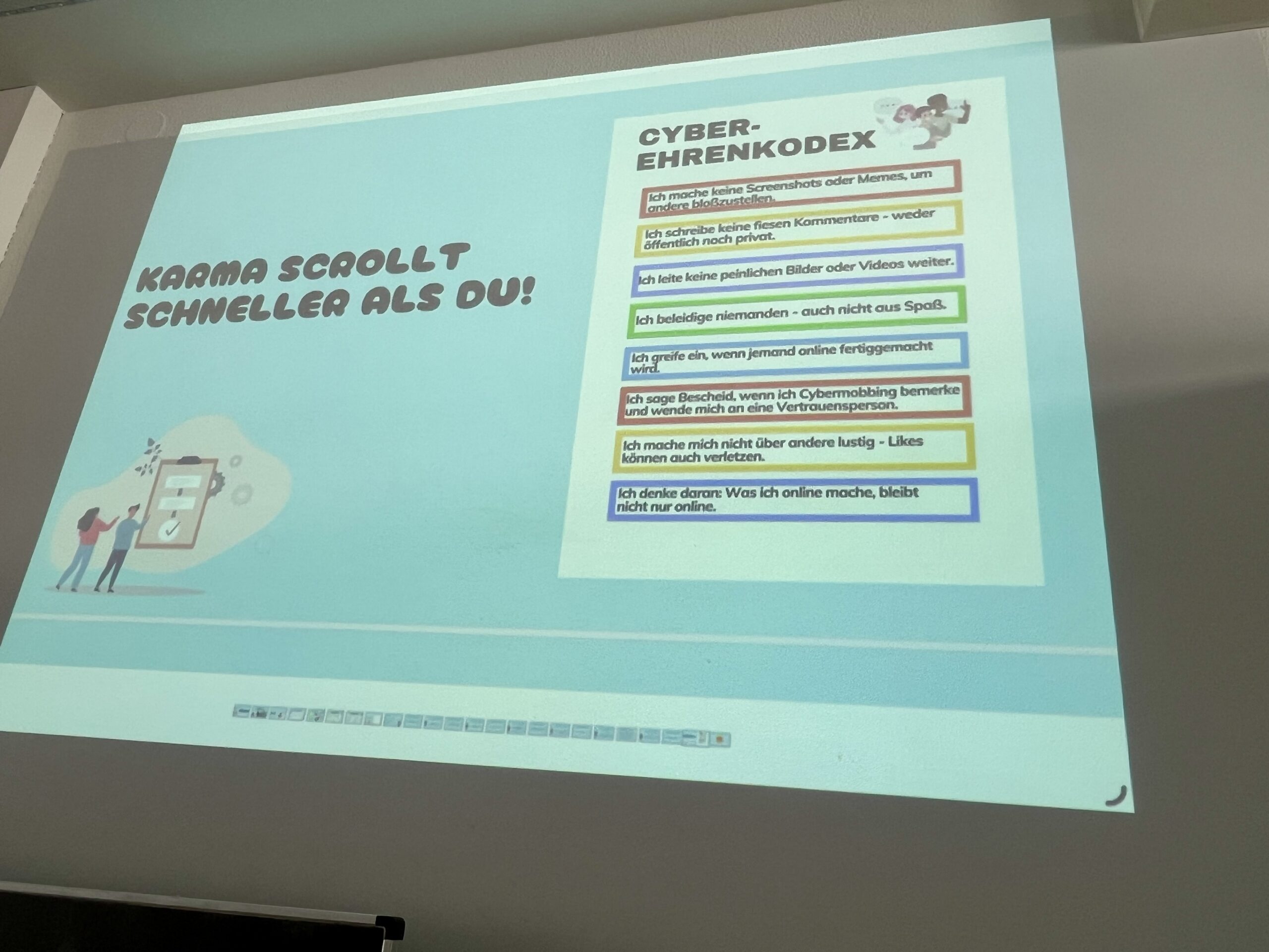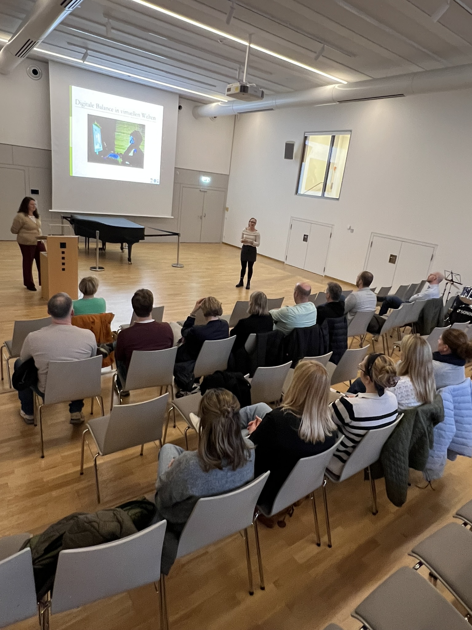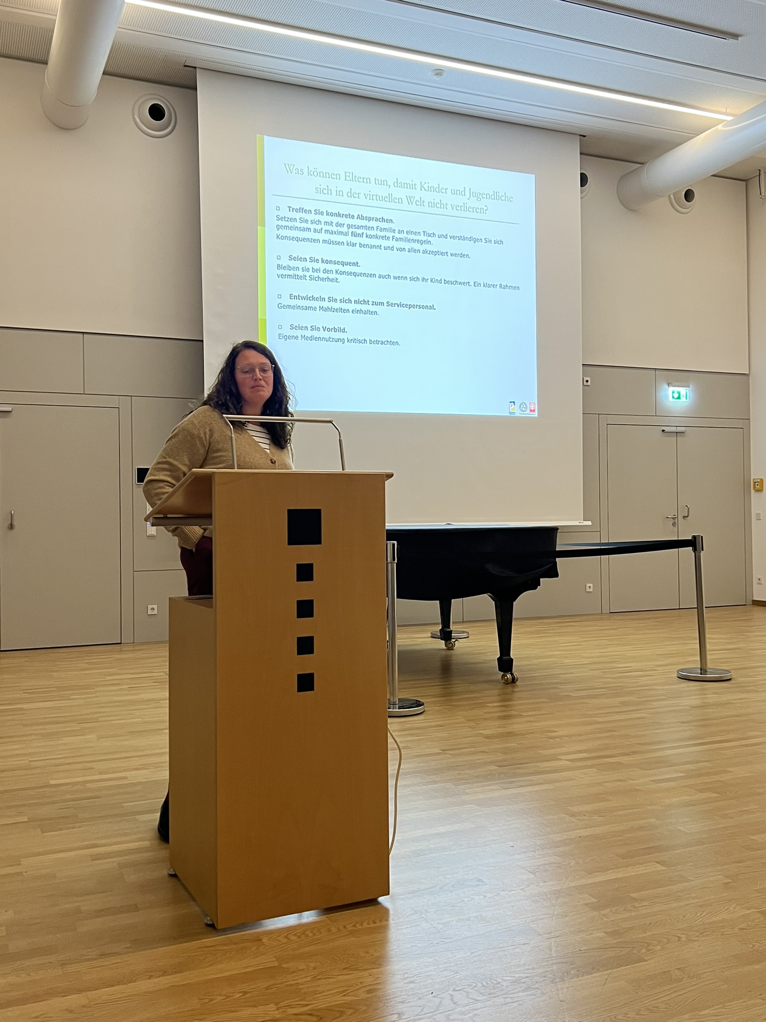 Die Eltern der Fünftklässler waren am Mittwochabend von deren Klassenlehrer/innen Frau Berger und Herrn Doffiné sowie Frau Flottmeier und Herrn Gindner ins Musikforum eingeladen, um eine Hilfestellung für den Umgang ihrer Kinder mit dem Internet zu erhalten. Die beiden Referentinnen, die bereits mit den Kindern gearbeitet hatten, informierten die Eltern zunächst einmal über die aktuellen sozialen Netzwerke und Spiele, bevor sie darauf eingingen, was für ihre Kinder die Faszination von ‚Social Media und Computerspielen ausmacht. Sie erläuterten auch, warum die Zeit der Pubertät eine besondere vulnerable Zeit für ihre Kinder ist und warum ihre konsequente, Grenzen setzende Elternfunktion in dieser Zeit besonders wichtig ist. Im Anschluss daran erhielten sie einen Überblick über die Online-Risiken für ihre Kinder, die von problematischen Inhaltsbereichen in Social Media über die Mediennutzungsdauer bis hin zur Opfer- oder Täterwerdung im Kontext von Cyber-Mobbing, -grooming, Sexting und Co, um anschließend intensiv auf Besonderheiten und Formen des Cyber-Mobbings einzugehen. Nach einem kurzen Blick auf das Täter- und Opferprofil, gaben die Referentinnen erste Tipps zur Cybermobbing-Intervention und klärten über mögliche rechtliche Schritte auf. Abschließend gingen sie noch einmal intensiv auf die erzieherische Verantwortung der Eltern im Rahmen von unkontrolliertem Medienkonsum im Kinder- und Jugendalter ein und gaben handfeste Tipps für die Medienerziehung in der Familie.
