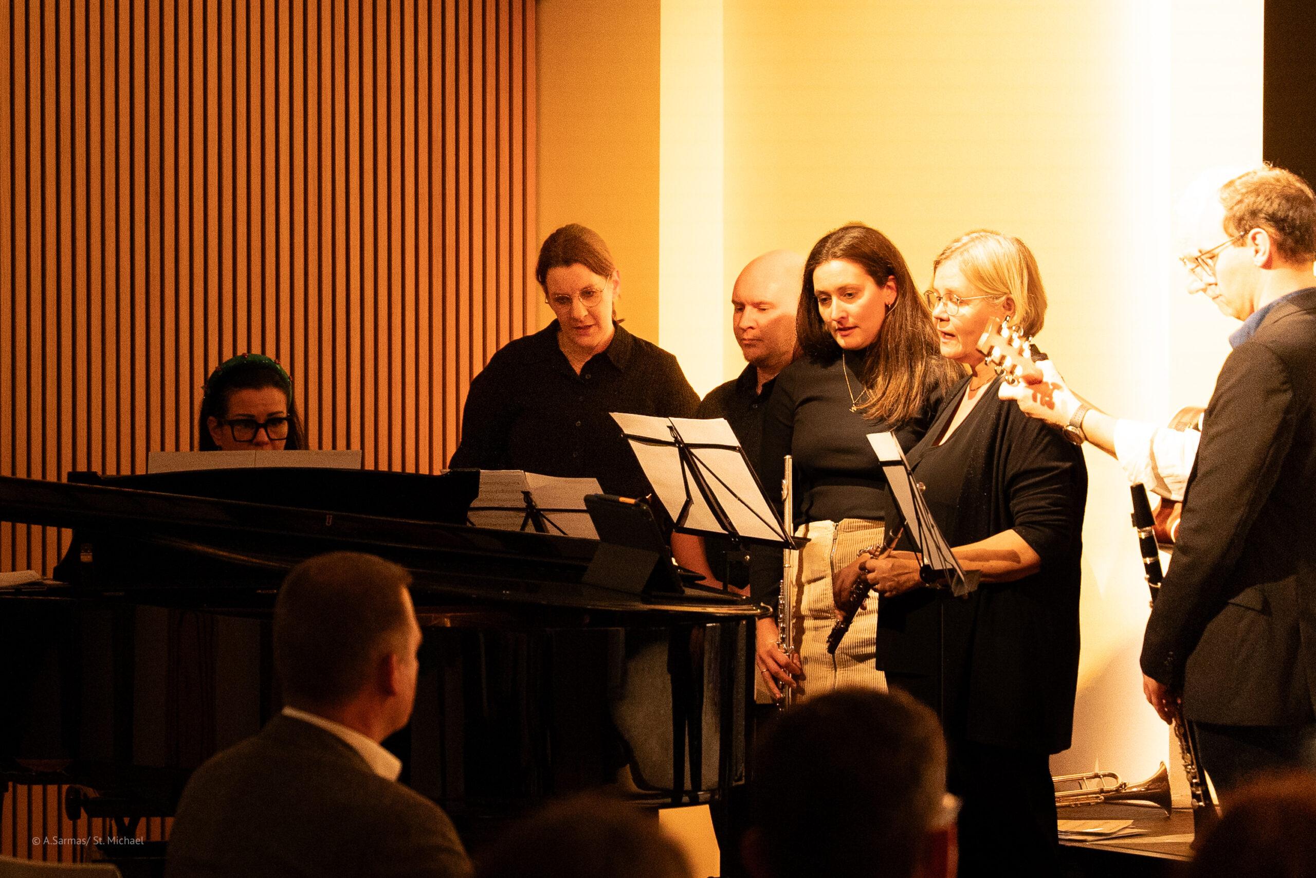 Das LehrerInnen-Ensemble, bestehend auf Julia Reinen, Caroline Waltemode, Anna Schmereim, Ursula und Stefan Jung, Thomas Koeper und Florian Gräf präsentierten gesanglich und auf ihren Musikinstrumenten zwei Überraschungsstücke, die sie mit „Christmassy surprise“ betitelten.
