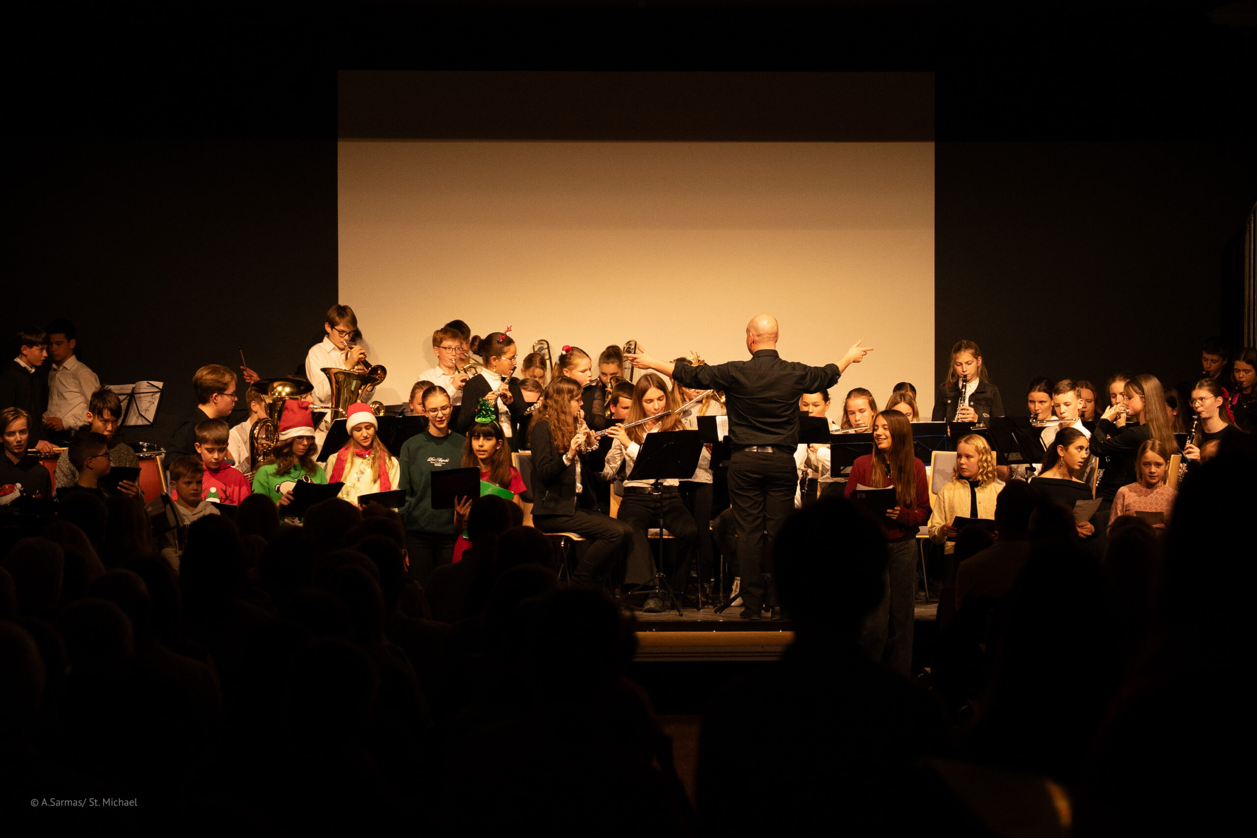 Einen weiteren Höhepunkt bildete dann das „Sinfonische Blasorchester“, das unter der Leitung von Florian Gräf, Antonio Ruiz-Gimenez und Ursula Jung der Zuhörerschaft musikalisch und auf einer gut gefüllten Bühne „Happy XMas“ wünschte. Im Anschluss daran kamen alle Anwesenden dann noch in den Genuss des Medleys „Holiday favourites“ – verbunden mit dem Auftrag, die verschiedenen Weihnachtslieder in ihrer Gesamtheit zu erkennen.