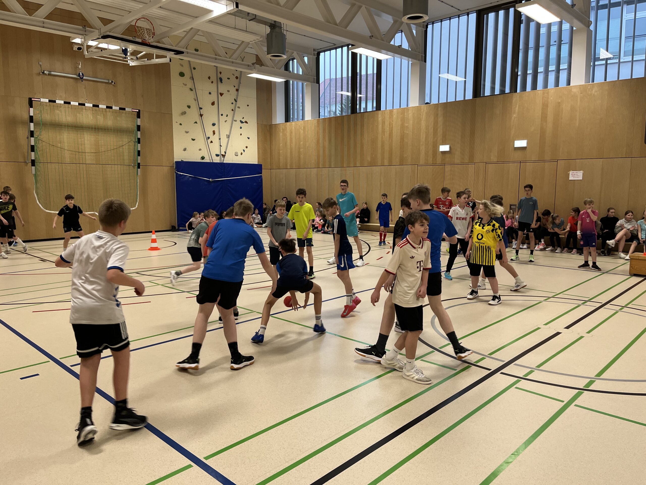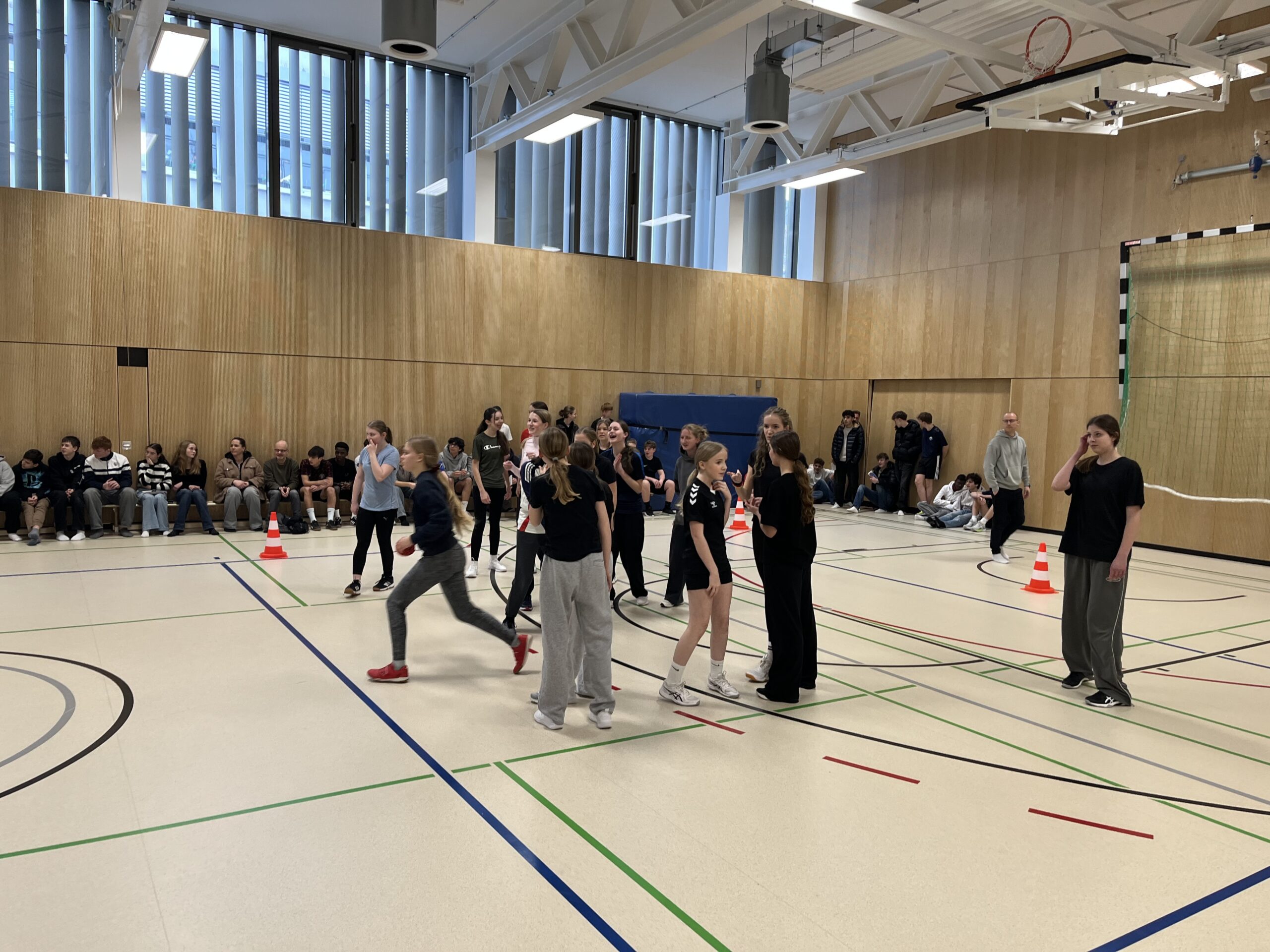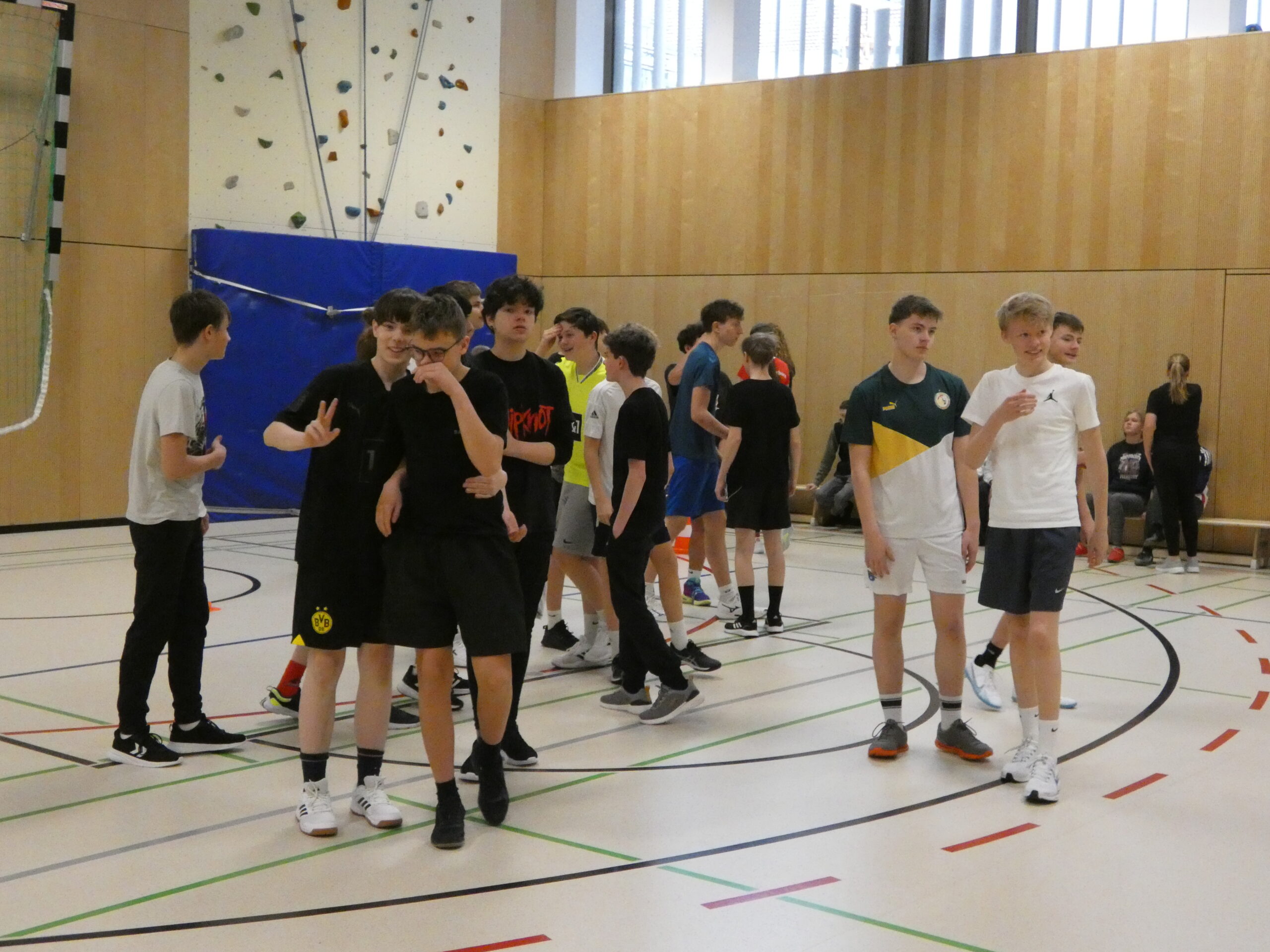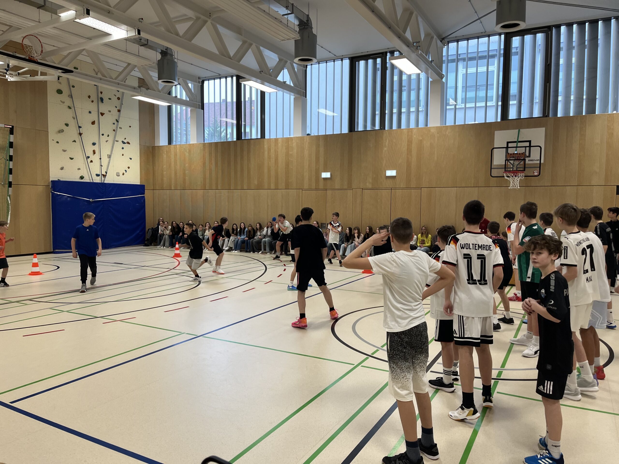 Ab 9.00 Uhr strömten die jeweiligen Klassen, die gegeneinander spielen sollten, mit ihren Fachlehrer/innen in die Halle 1 der Dreifachturnhalle. Jede Klasse hatte ein Spiel mit einer reinen Spielzeit von 15 Minuten.