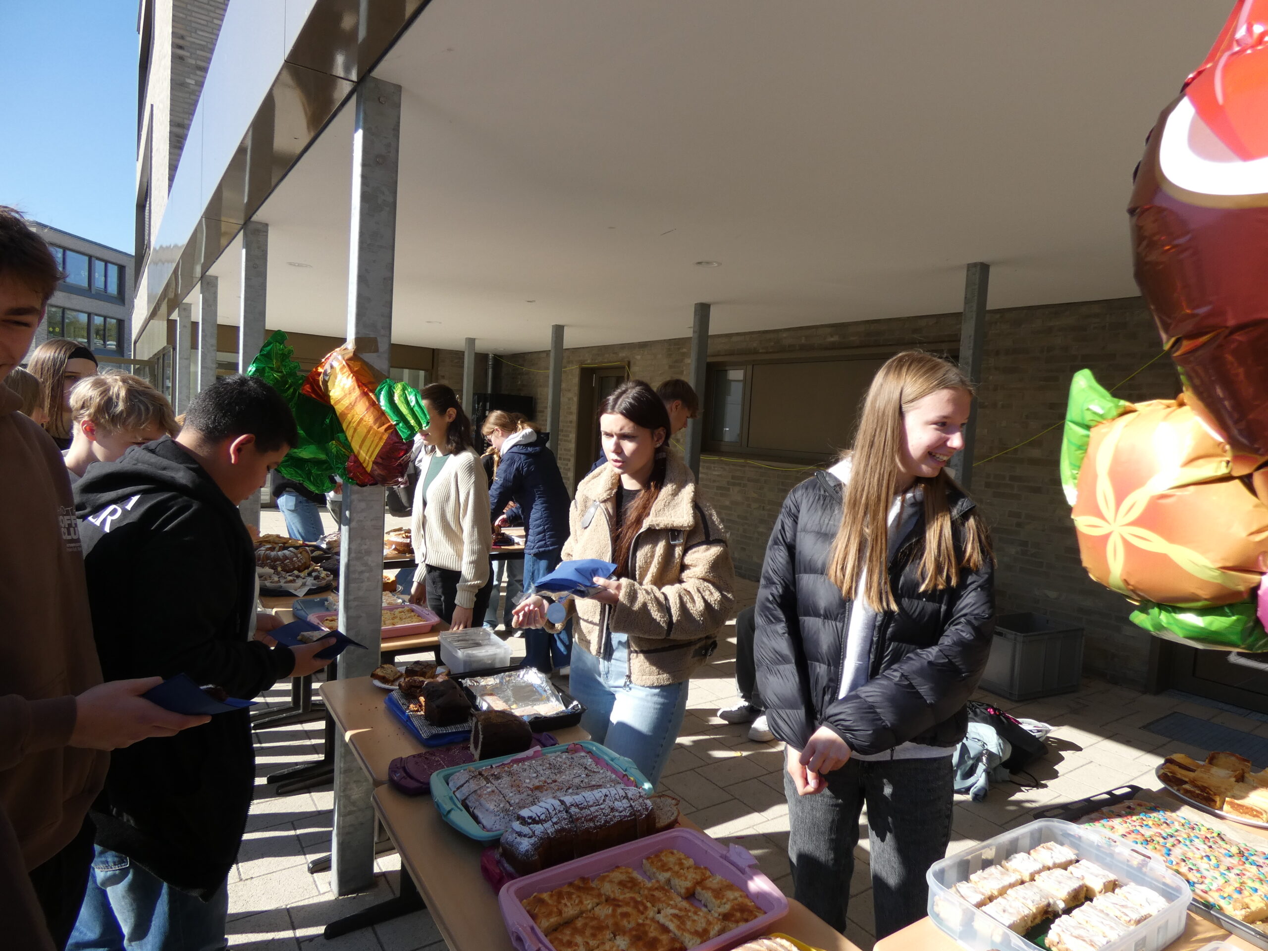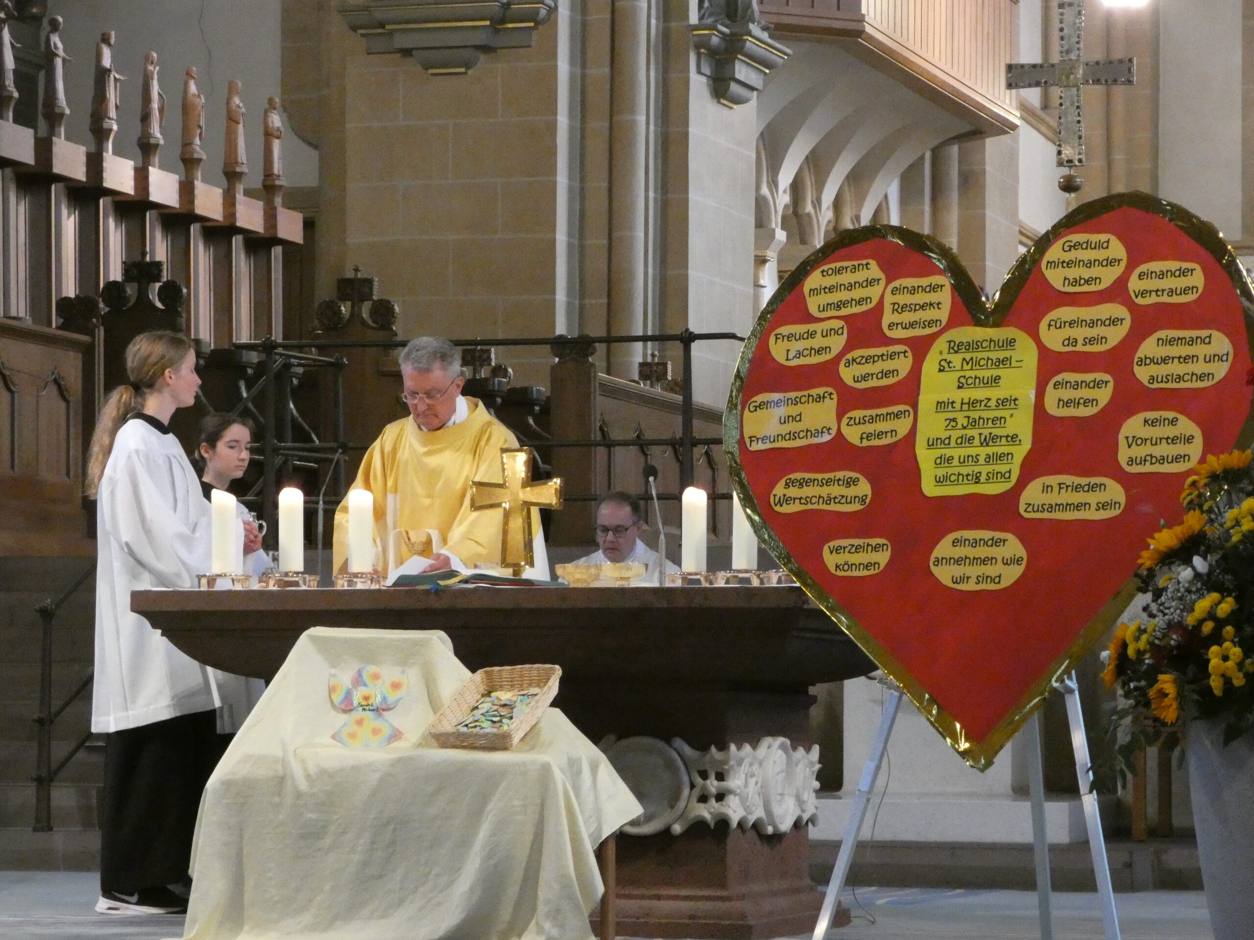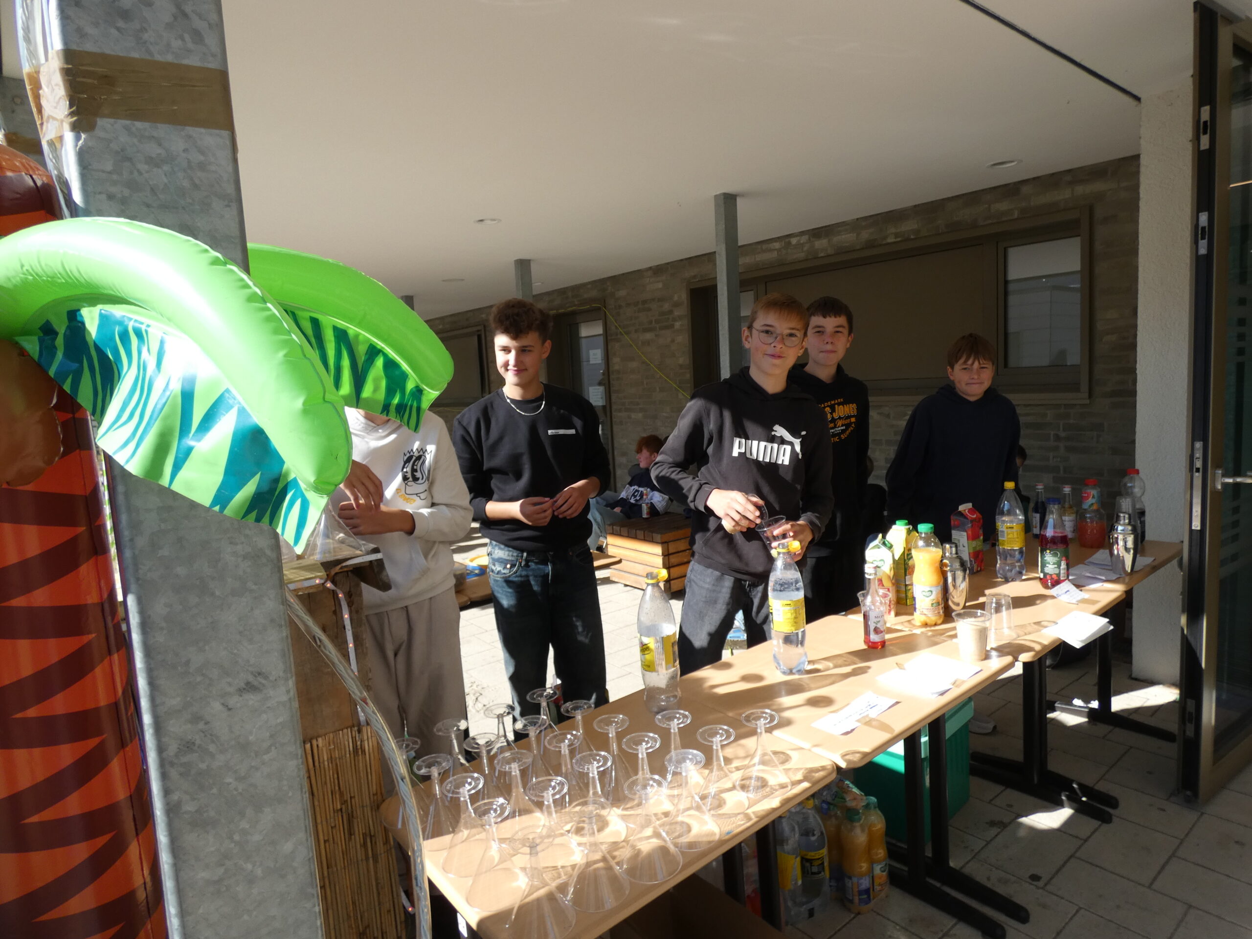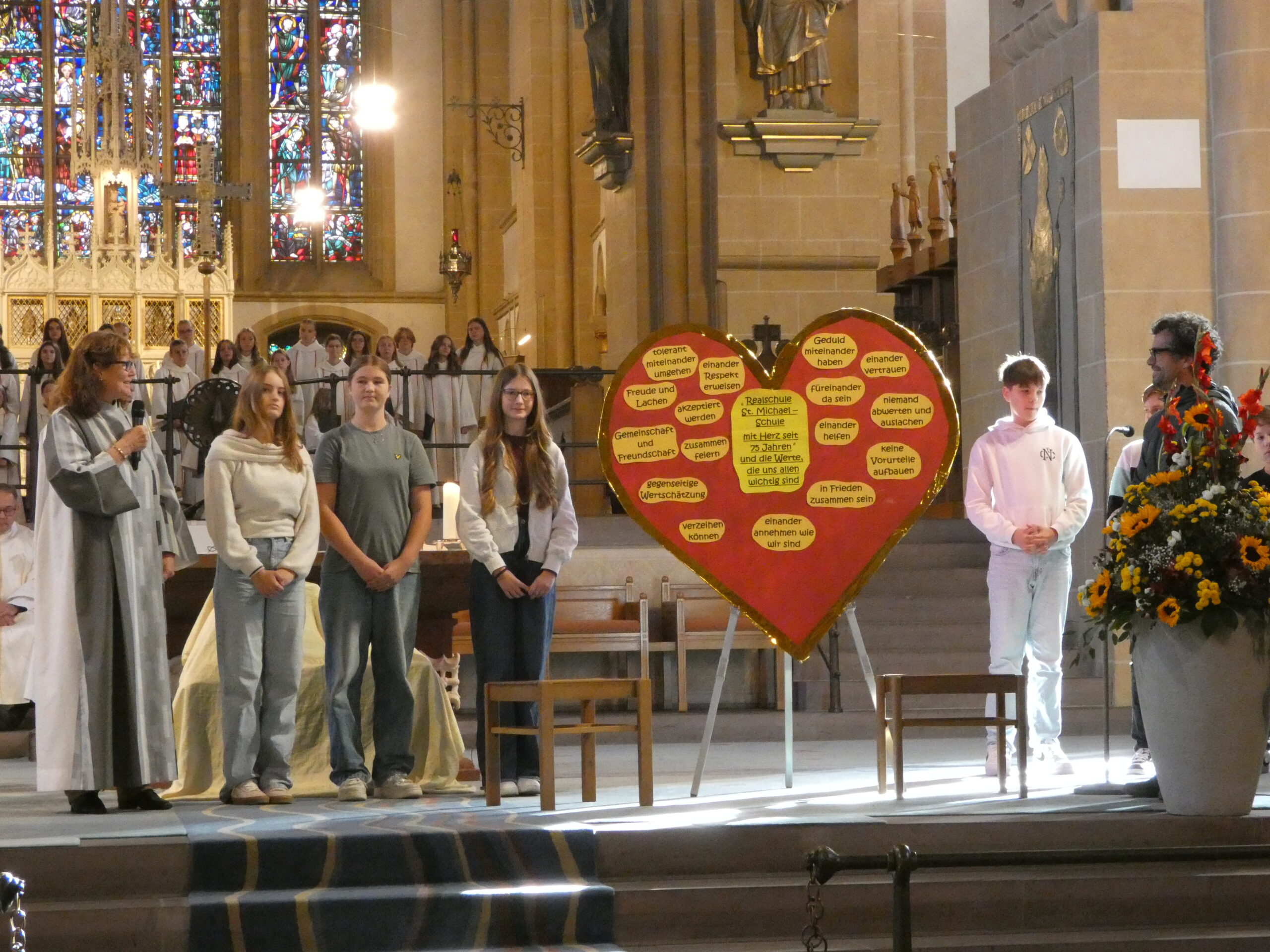 Am nächsten Morgen begann unser Schulfest mit einem feierlichen Festgottesdienst im Hohen Dom zu Paderborn, an dessen Abschluss alle getreu dem Motto des Jubiläums „Schule mit Herz seit 75 Jahren“ ein während der Projekttage gebasteltes kleines Herz erhielten. Anschließend präsentierten die Gruppen ihre beeindruckenden Arbeitsergebnisse auf dem Schulgelände, wozu die Eltern herzlich eingeladen waren und auch zahlreich erschienen. Für das leibliche Wohl sorgten ein buntes Kuchenbuffet, das von den Eltern bestückt wurde, sowie die Cocktail-Bar mit Lounge, die von zwei Projekten vorbereitet und organisiert wurde. Alle genossen es, die Früchte ihrer Arbeit gegenseitig zu bewundern und eine schöne Zeit zusammen zu verbringen. An diesem Tag begrüßte die Schulgemeinschaft auch offiziell unsere neue stellvertretende Schulleiterin Simone Flottmeier, indem die Schülervertretung ihr ein Willkommensgeschenk überreichte und sie im Namen aller anwesenden Schülerinnen und Schüler herzlich willkommen hieß und ihr alles Gute für ihre Zeit an der Realschule St. Michael wünschte. Aufgeräumt wurde schließlich am Donnerstag in der ersten Stunde und dann wartete noch eine besondere Überraschung der Schulleitung auf alle Schüler/innen: Ein Eiswagen erwartete die Schulgemeinschaft der Realschule auf dem Schulhof und beglückte jeden mit einem leckeren kostenlosen Softeis.