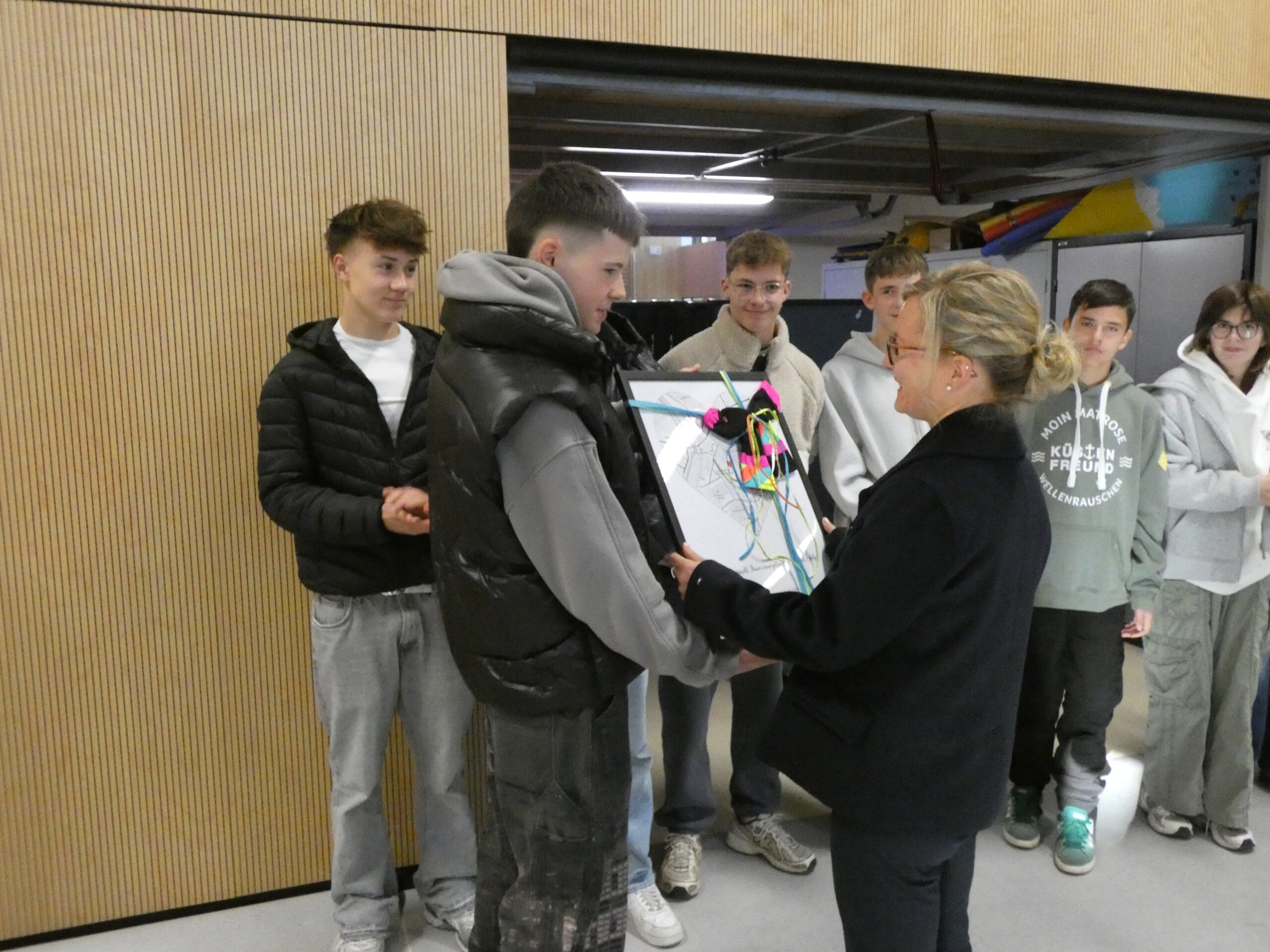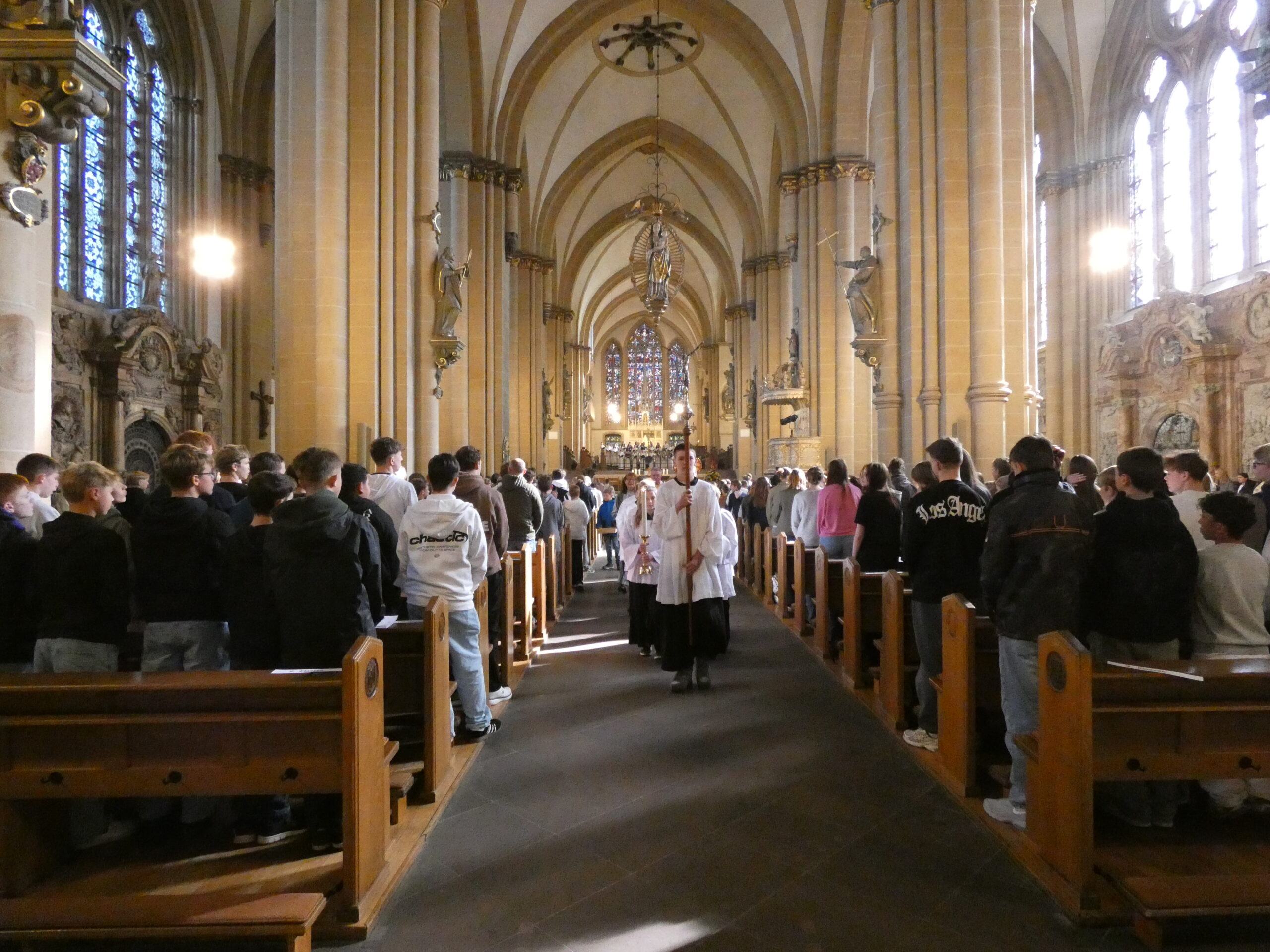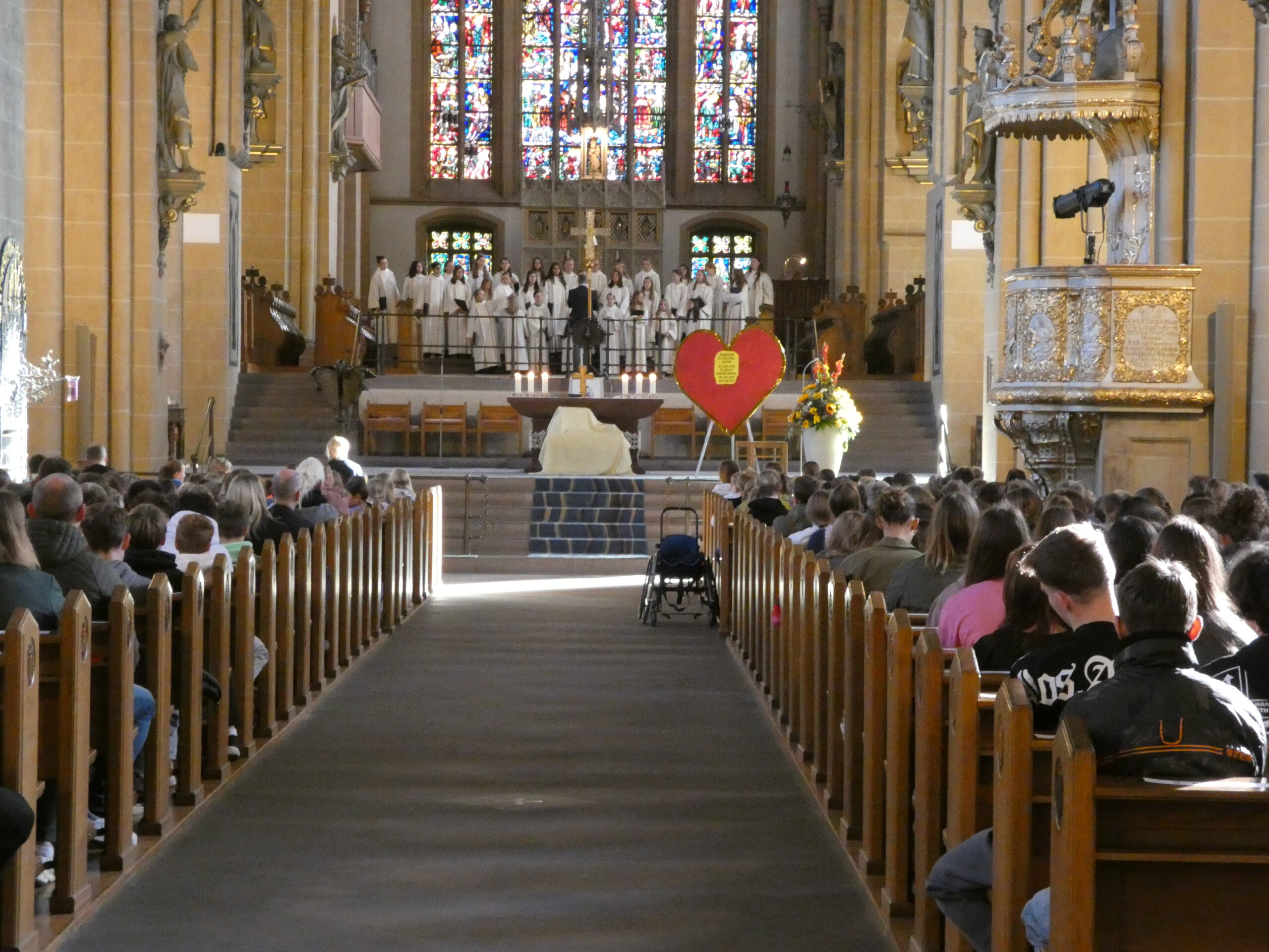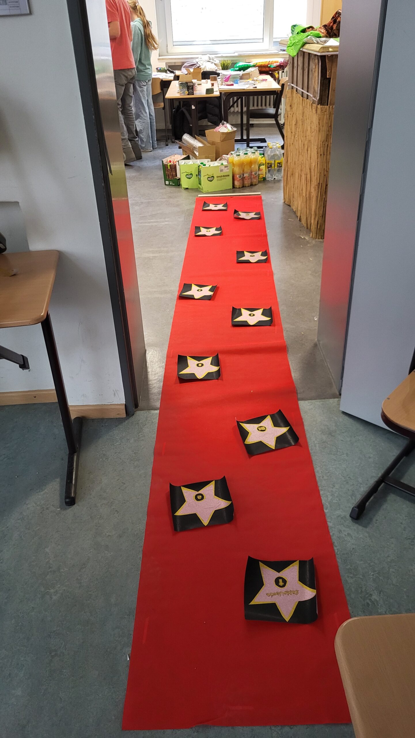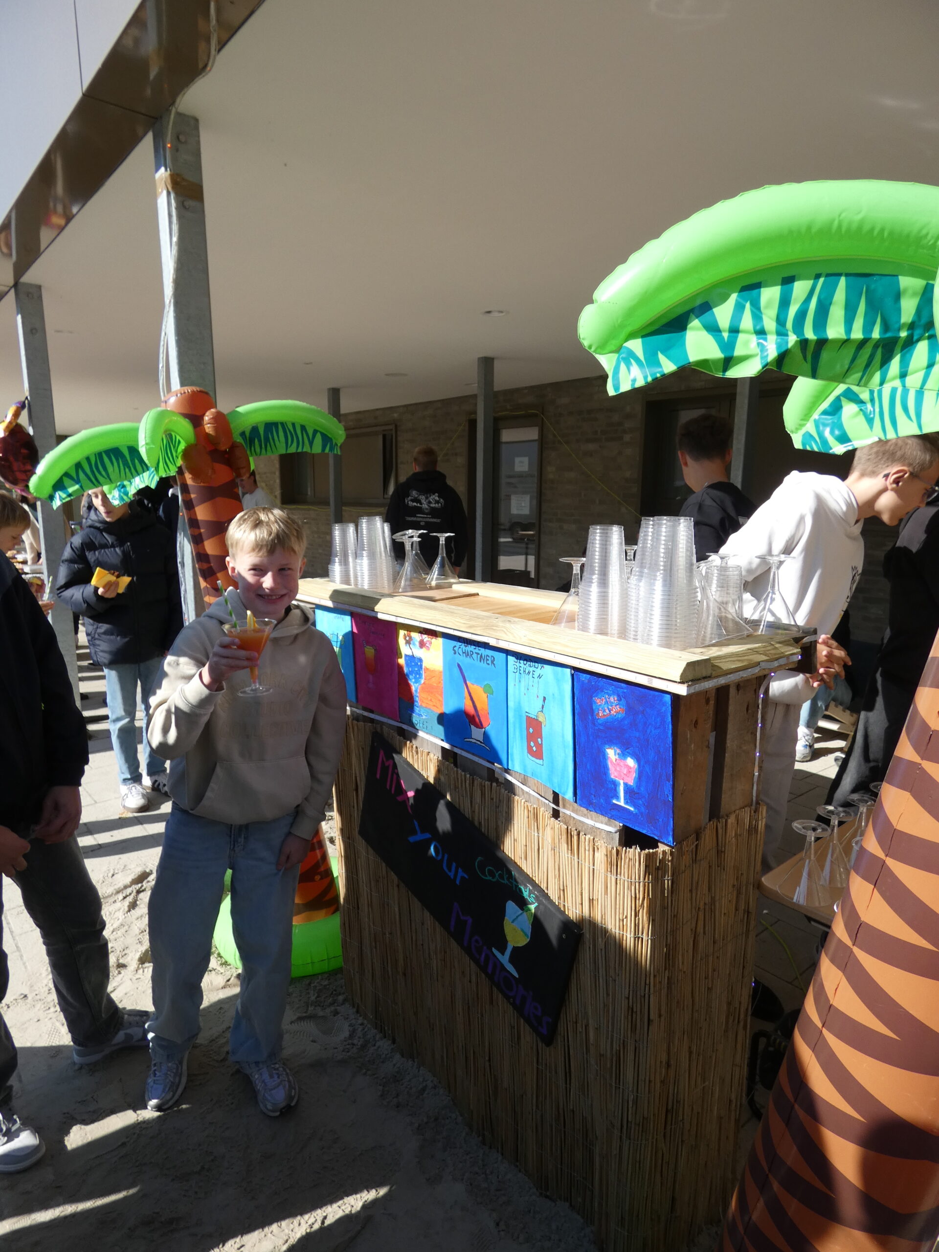 Am nächsten Morgen begann unser Schulfest mit einem feierlichen Festgottesdienst im Hohen Dom zu Paderborn, an dessen Abschluss alle getreu dem Motto des Jubiläums „Schule mit Herz seit 75 Jahren“ ein während der Projekttage gebasteltes kleines Herz erhielten. Anschließend präsentierten die Gruppen ihre beeindruckenden Arbeitsergebnisse auf dem Schulgelände, wozu die Eltern herzlich eingeladen waren und auch zahlreich erschienen. Für das leibliche Wohl sorgten ein buntes Kuchenbuffet, das von den Eltern bestückt wurde, sowie die Cocktail-Bar mit Lounge, die von zwei Projekten vorbereitet und organisiert wurde. Alle genossen es, die Früchte ihrer Arbeit gegenseitig zu bewundern und eine schöne Zeit zusammen zu verbringen. An diesem Tag begrüßte die Schulgemeinschaft auch offiziell unsere neue stellvertretende Schulleiterin Simone Flottmeier, indem die Schülervertretung ihr ein Willkommensgeschenk überreichte und sie im Namen aller anwesenden Schülerinnen und Schüler herzlich willkommen hieß und ihr alles Gute für ihre Zeit an der Realschule St. Michael wünschte. Aufgeräumt wurde schließlich am Donnerstag in der ersten Stunde und dann wartete noch eine besondere Überraschung der Schulleitung auf alle Schüler/innen: Ein Eiswagen erwartete die Schulgemeinschaft der Realschule auf dem Schulhof und beglückte jeden mit einem leckeren kostenlosen Softeis.
